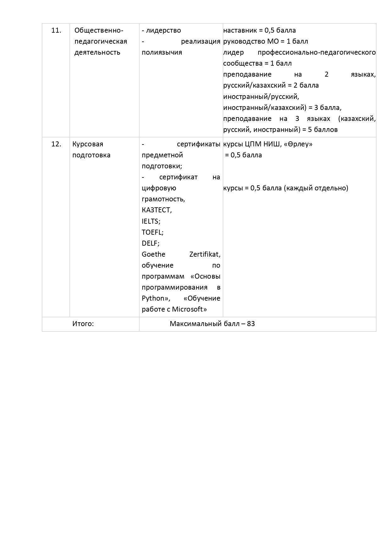 9) Ұлттық біліктілік тестілеу сертификаты немесе педагог-модератордың, педагог-сарапшының, педагог-зерттеушінің, педагог-шебердің біліктілік санатының болуы туралы куәлік( болған жағдайда).