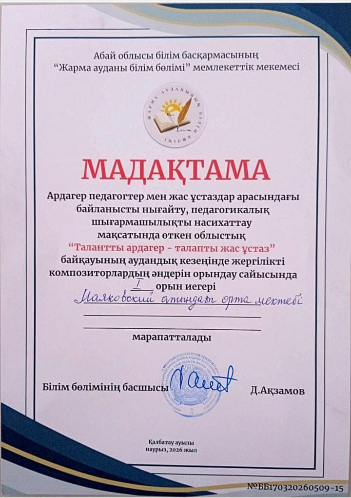 🎶«Талантты ардагер – талапты жас ұстаз» атты АУДАНДЫҚ байқауда ұстаздарымыз жоғары өнерлерін көрсетіп, жүлделі І ОРЫНДЫ иеленді.