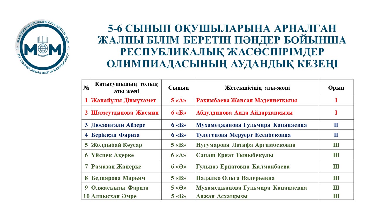 14-15 қараша күндері «Жарма ауданы білім бөлімі» ММ-нің ұйымдастыруымен 5-6 сынып оқушыларына арналған жалпы білім беретін пәндер бойынша республикалық жасөспірімдер олимпиадасының аудандық кезеңі өтті. Олимпиадаға мектебімізден 16 оқушы қатысып, 10 жүлделі орынға ие болды. І-орын жеңімпаздары облыстық кезеңге жолдама алды.