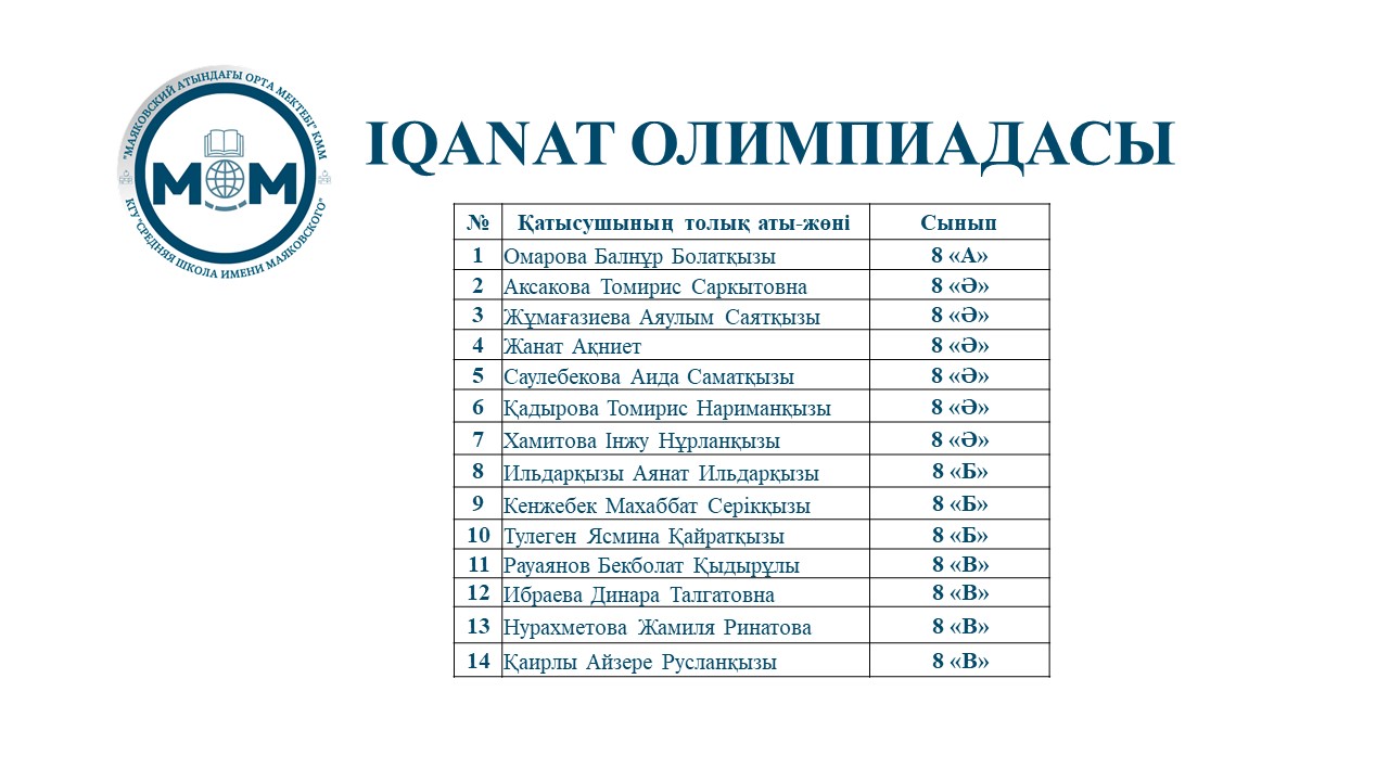 Еліміздің ауылдық жалпы білім беретін мектептері оқушыларының зияткерлік әлеуетін қалыптастыруға ықпал ету, сондай-ақ ауыл мектептері оқушыларының ынтасын арттыру мақсатында өткен IQANAT олимпиадасының ІІ-КЕЗЕҢІНЕ мектебіміздің 14 оқушысы жолдама алды.