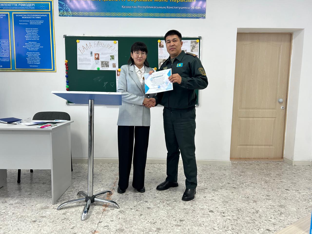 18 желтоқсан күні “Оқушылардың бойында батылдық, алғырлық әскери амал-тәсілдерді қалыптастырудағы әскери-техникалық дайындықтың рөлі мен маңызы” тақырыбында өткен алғашқы әскери және технологиялық дайындық пәні мұғалімдеріне арналған АУДАНДЫҚ семинарда мектебіміздің офицер-тәрбиешісі ЕСМҰРАТОВ АРМАН ҚАЖЫМҰРАТҰЛЫ “Жас Сарбаз” сыныбы патриоттыққа тәрбиелейді” тақырыбында іс-тәжірибиесімен бөлісті.
