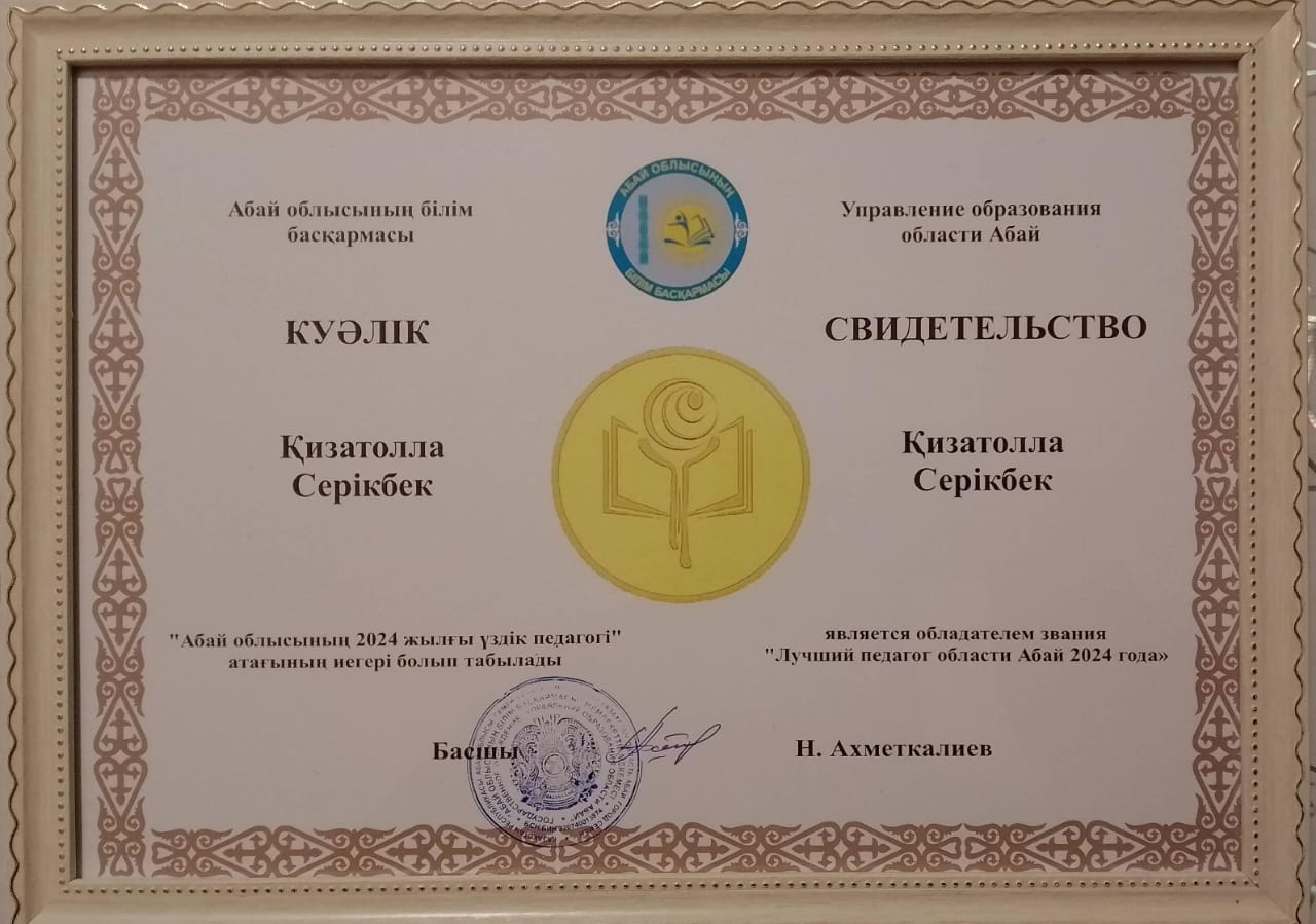 📌Абай облысының білім басқармасының "АБАЙ ОБЛЫСЫНЫҢ 2024 ЖЫЛҒЫ ҮЗДІК ПЕДАГОГІ" атағының иегері болып табылатын КУӘЛІК
