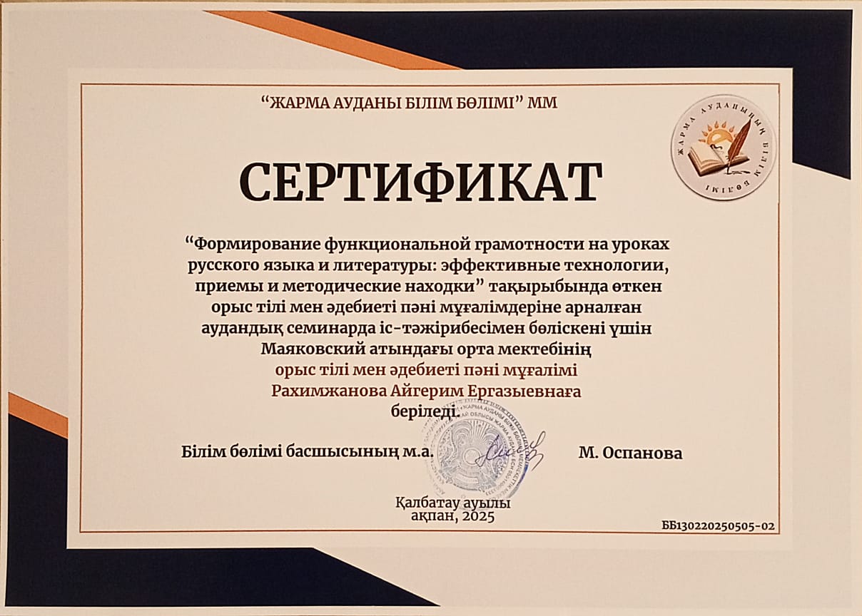 📌Орыс тілі мен әдебиеті сабақтарында оқушылардың функционалдық сауаттылығын қалыптастыру және мұғалімнің шеберлігін арттыруда әртүрлі әдіс-тәсілдерді қолдану мақсатында өткен семинарға мектебіміздің орыс тілі мен әдебиеті пәні мұғалімі РАХИМЖАНОВА АЙГЕРИМ ЕРГАЗЫЕВНА қатысып, өз іс-тәжірибесімен бөлісіп қайтты.