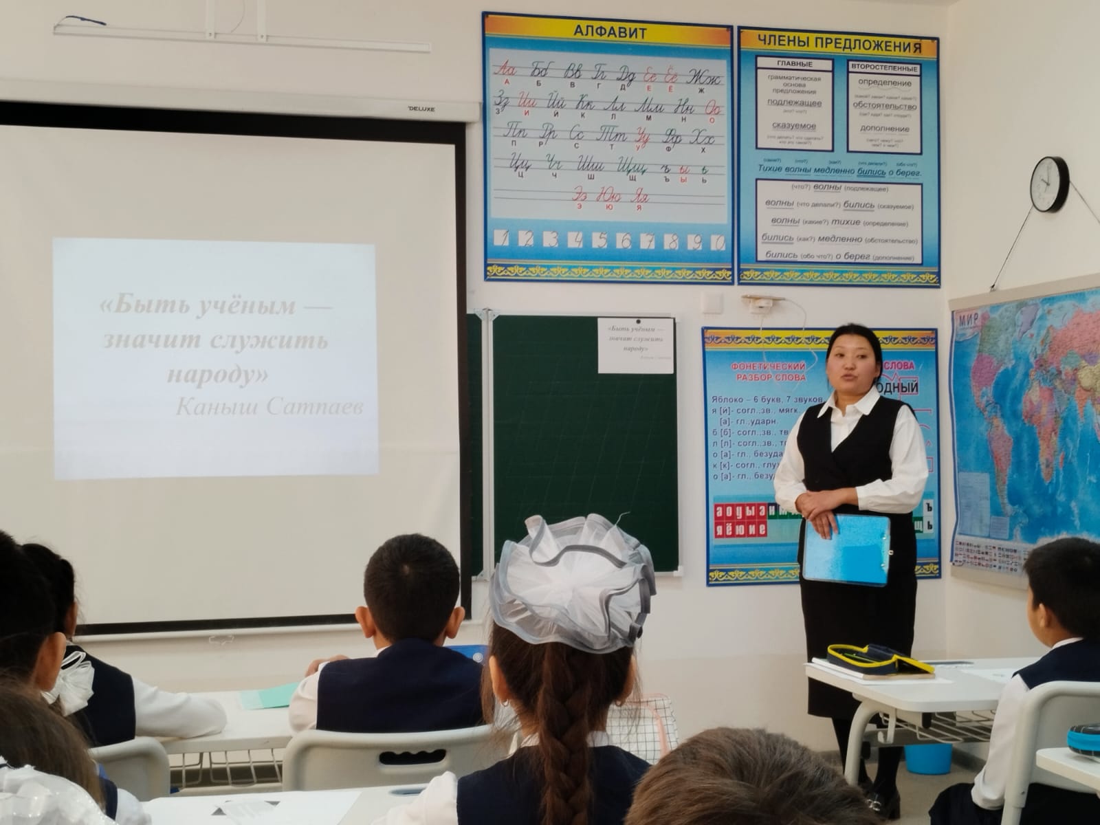✅18 ноября в рамках недели начальных классов с русским языком обучения классным руководителем 4 "В" класса ЖЕБРАИЛ АНАР ГАЛЛИДУЛЛАЕВНОЙ был проведён открытый урок по познанию мира на тему «Развитие науки в Казахстане. Каныш Имантаевич Сатпаев»