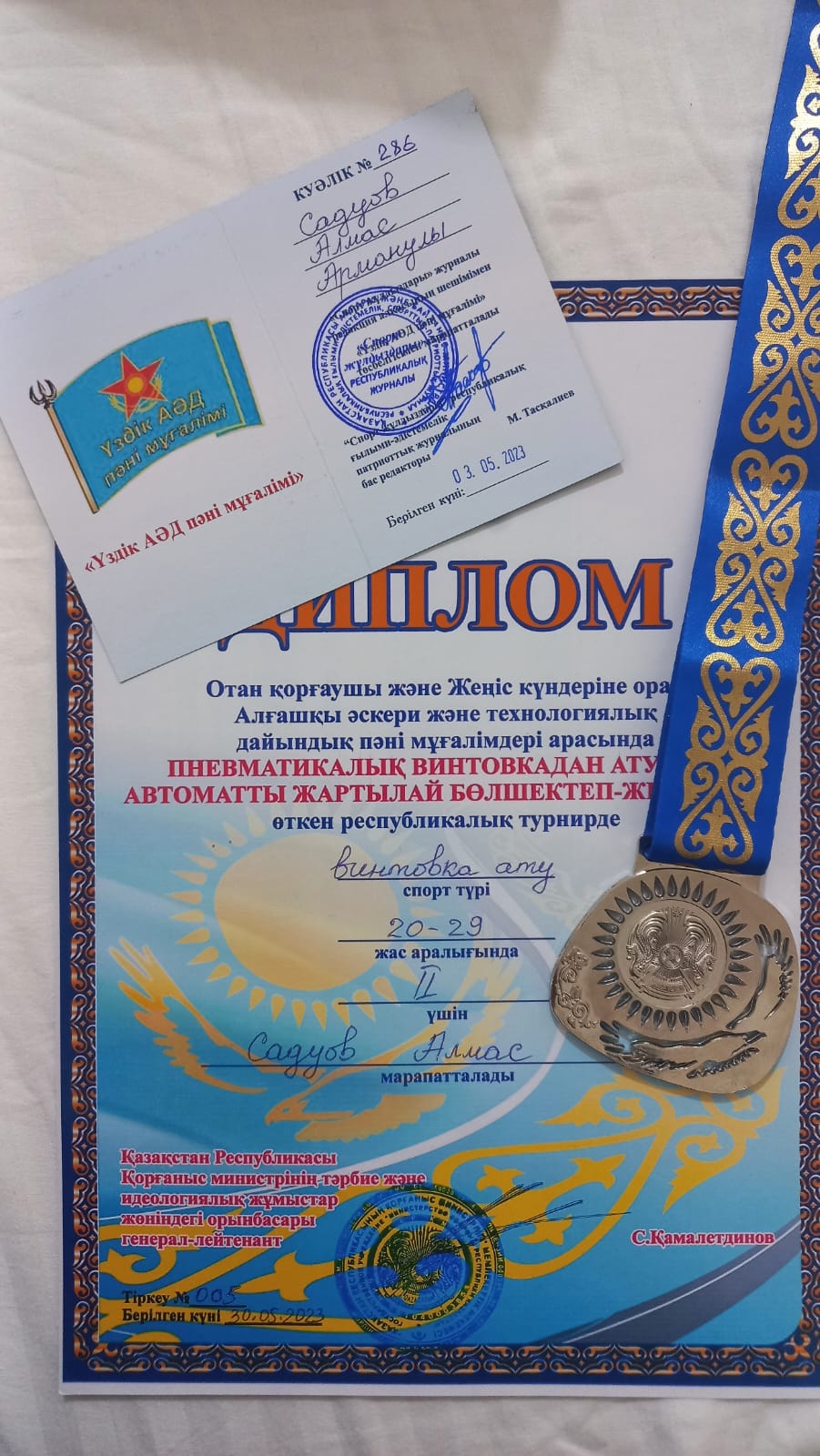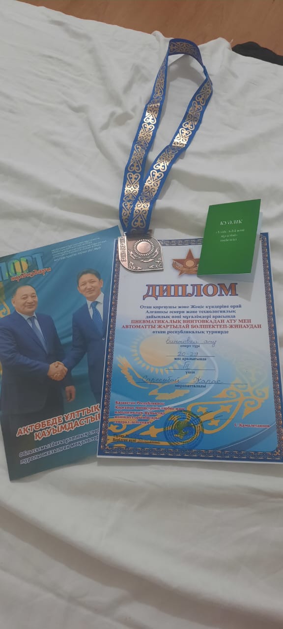 2023 жылы 3 мамыр күні Шымкент қаласында өткен "Спорт жұлдыздары" журналының Отан қорғаушы және Жеңіс күндеріне орай Алғашқы әскери және технологиялық дайындық пәні мұғалімдері арасында пневматикалық винтовкадан ату, автоматты жартылай бөлшектеп-жинақтаудан өткен республикалық турнирде мектебіміздің "Жас сарбаз" сыныбының офицер-тәрбиешілері Садуов Алмас Арманұлы қатысып ІІ жүлделі орынға, Сәрсембай Жарас Серікқанұлы ІІІ-орынға ие болды, "Үздік АӘТД пәні мұғалімі" төсбелгісімен марапатталды. Құттықтаймыз!!!