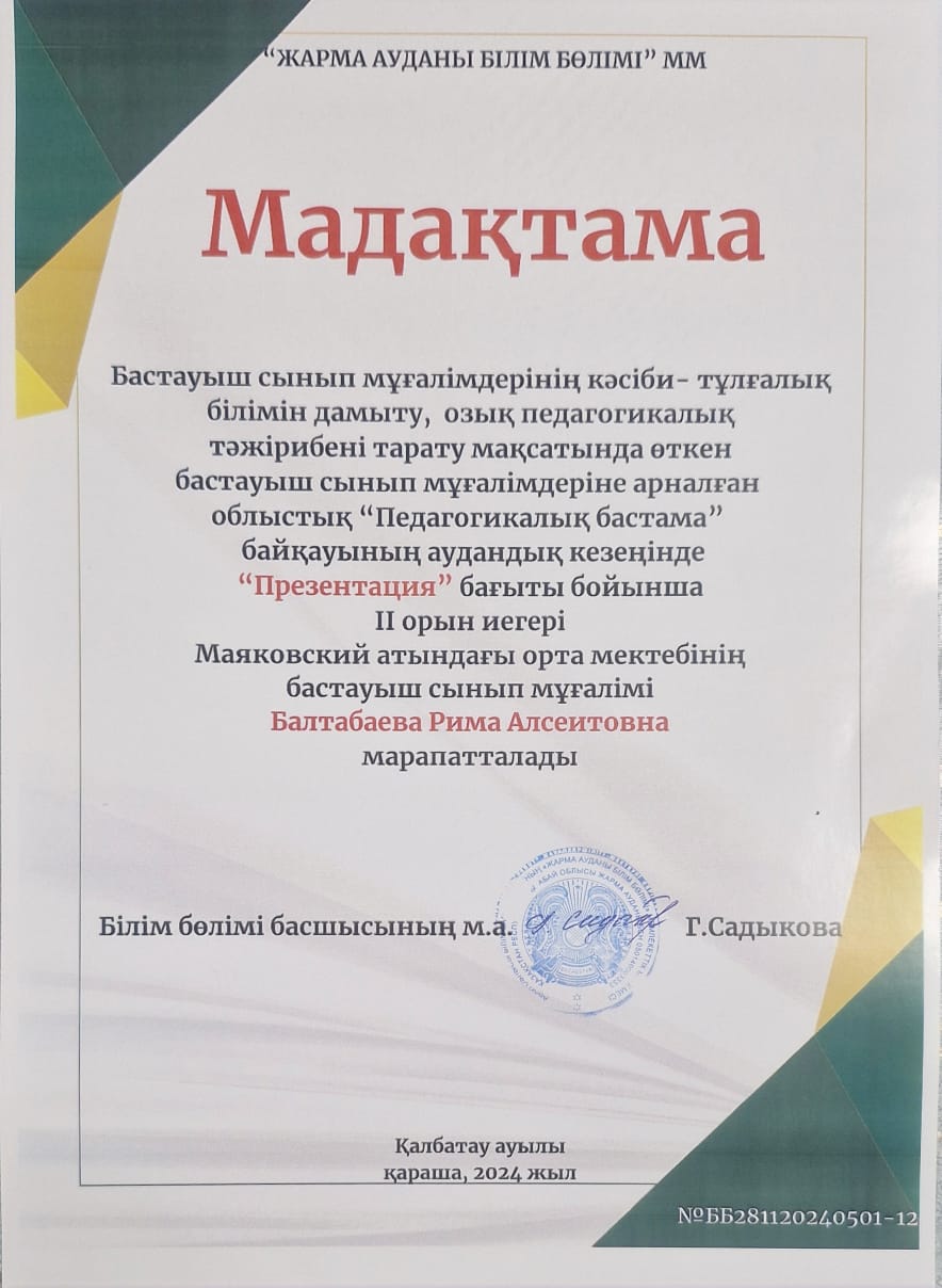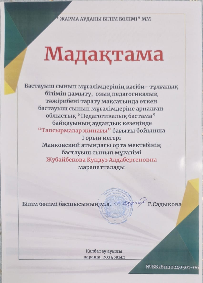 Бастауыш сынып мұғалімдерінің кәсіби-тұлғалық білімін дамыту, озық педагогикалық тәжірибені тарату мақсатында өткен бастауыш сынып мұғалімдеріне арналған облыстық «Педагогикалық бастама» байқауының АУДАНДЫҚ кезеңінде «Тапсырмалар жинағы» бағыты бойынша мектебіміздің бастауыш сынып мұғалімі ЖҰБАЙБЕКОВА ҚҰНДЫЗ АЛДАБЕРГЕНОВНА жүлделі І ОРЫНДЫ иеленсе, «Презентация» бағыты бойынша жүлделі ІІ ОРЫНДЫ бастауыш сынып мұғалімі БАЛТАБАЕВА РИММА АЛЬСЕИТОВНА жеңіп алды.