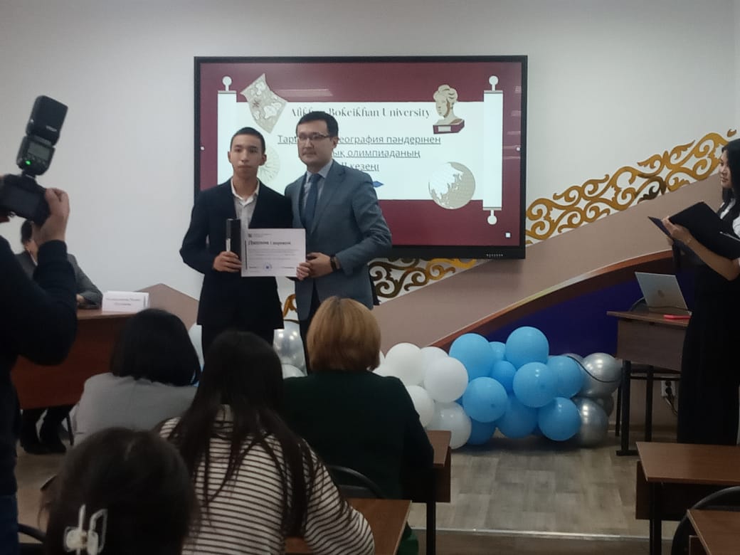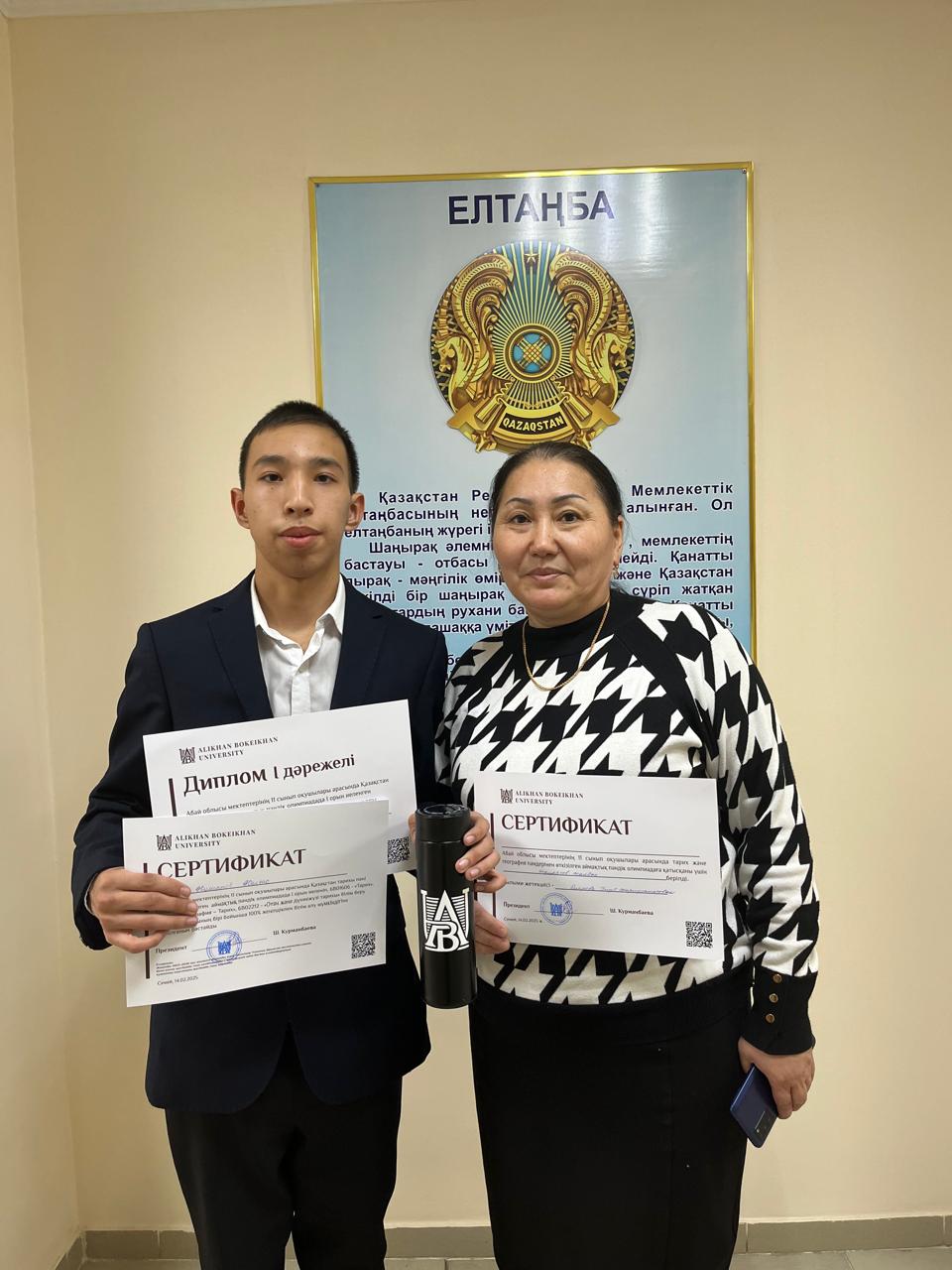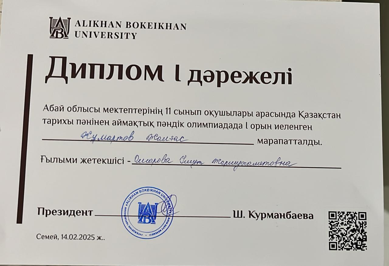 ✅ 2025 жылы 14 ақпан күні Абай облысы мектептерінің 11 сынып оқушылары арасында Alikhan Bokeikan University ұйымдастырған Қазақстан тарихы пәні бойынша өткізілген АЙМАҚТЫҚ ПӘНДІК ОЛИМПИАДАДА мектебіміздің 11 сынып оқушысы ЖҰМАРТОВ ЖАЛҒАС І ОРЫНДЫ иеленіп, «Тарих», «География-Тарих», «Отан және дүниежүзі тарихы» білім беру бағдарламаларының бірі бойынша 100% ЖЕҢІЛДІКПЕН БІЛІМ АЛУ МҮМКІНДІГІНЕ ие болды.