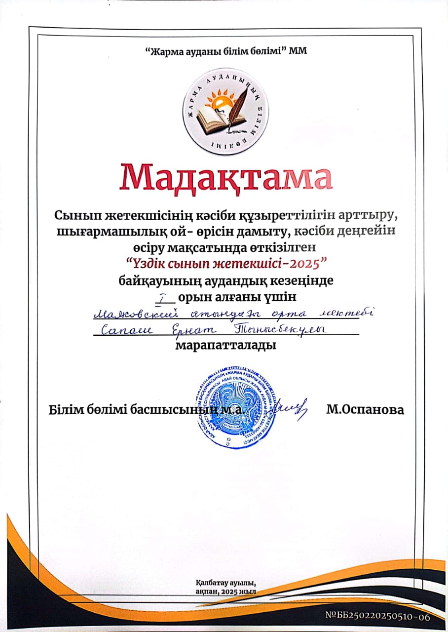 ✅Сынып жетекшісінің кәсіби құзіреттілігін арттыру, шығармашылық ой-өрісін дамыту, кәсіби деңгейін өсіру мақсатында өткен "ҮЗДІК СЫНЫП ЖЕТЕКШІСІ-2025" байқауының АУДАНДЫҚ кезеңінде САПАШ ЕРНАТ ТЫНЫБЕКҰЛЫ жүлделі І ОРЫНДЫ иеленді.