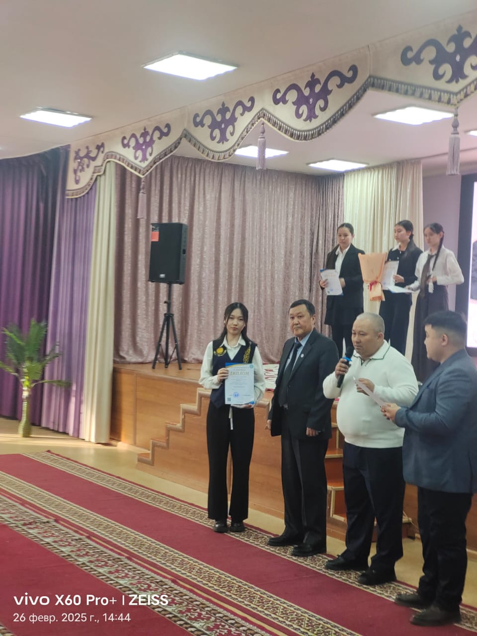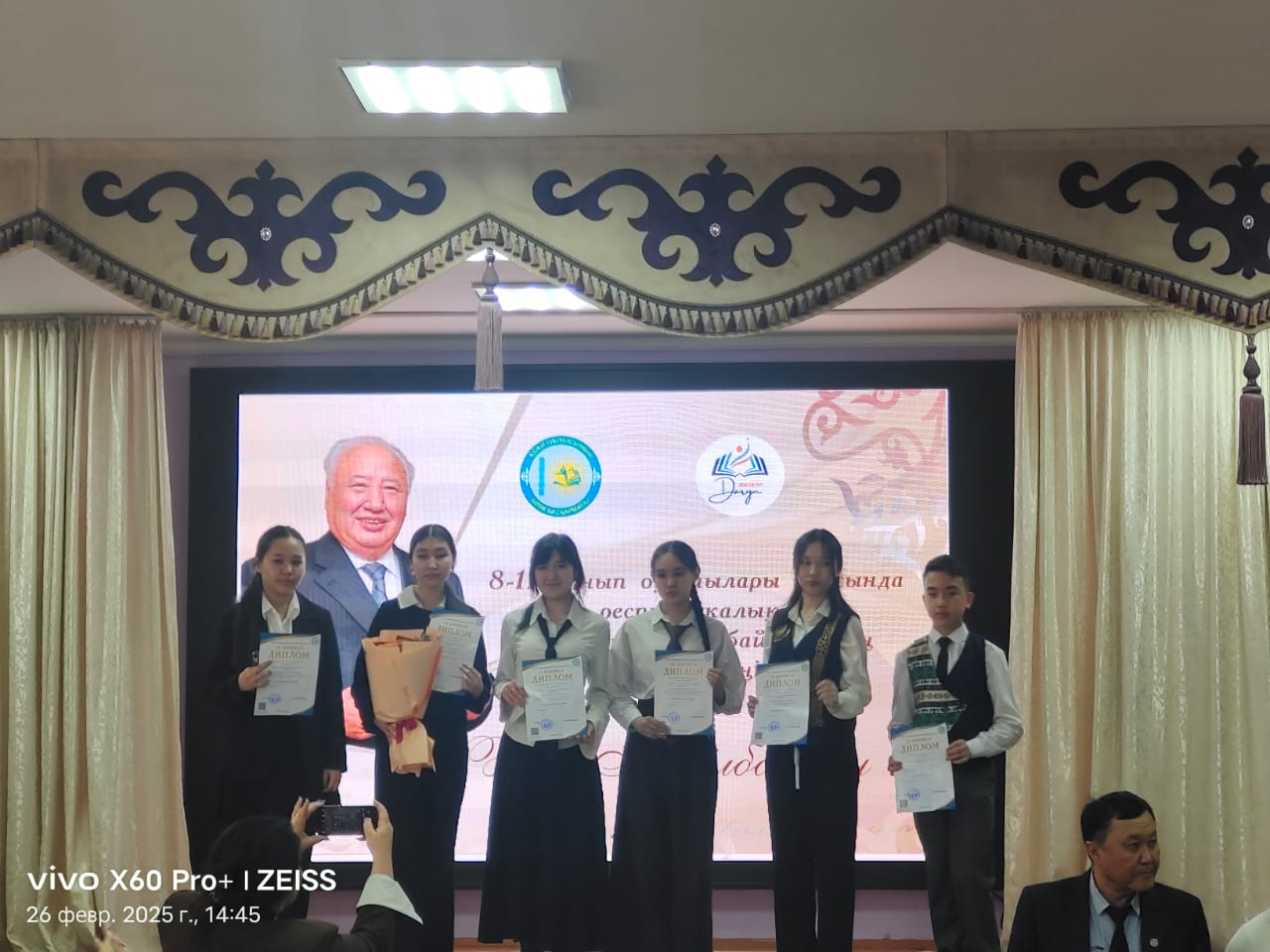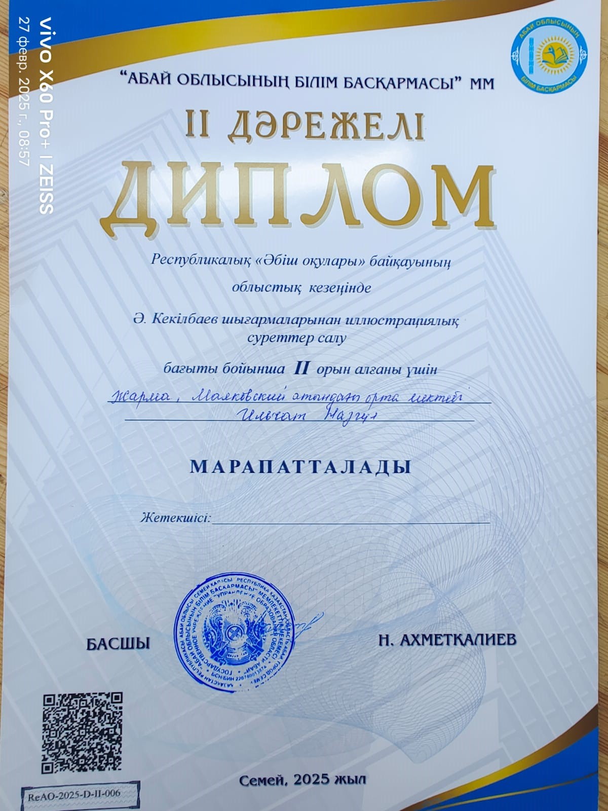 ✅26 ақпан 2025 жылы жалпы білім беретін мекемелерінің оқушылары арасында республикалық «ӘБІШ КЕКІЛБАЕВ ОҚУЛАРЫ» ғылыми-шығармашылық байқауының ОБЛЫСТЫҚ кезеңінде «ӘБІШ КЕКІЛБАЕВ ШЫҒАРМАЛАРЫНА ИЛЛЮСТАЦИЯЛЫҚ СУРЕТТЕР САЛУ» бағыты бойынша 10 «А» сынып оқушысы ИЛЬЧАТ НАЗГҮЛ жүлделі ІІ ОРЫНҒА ие болды.