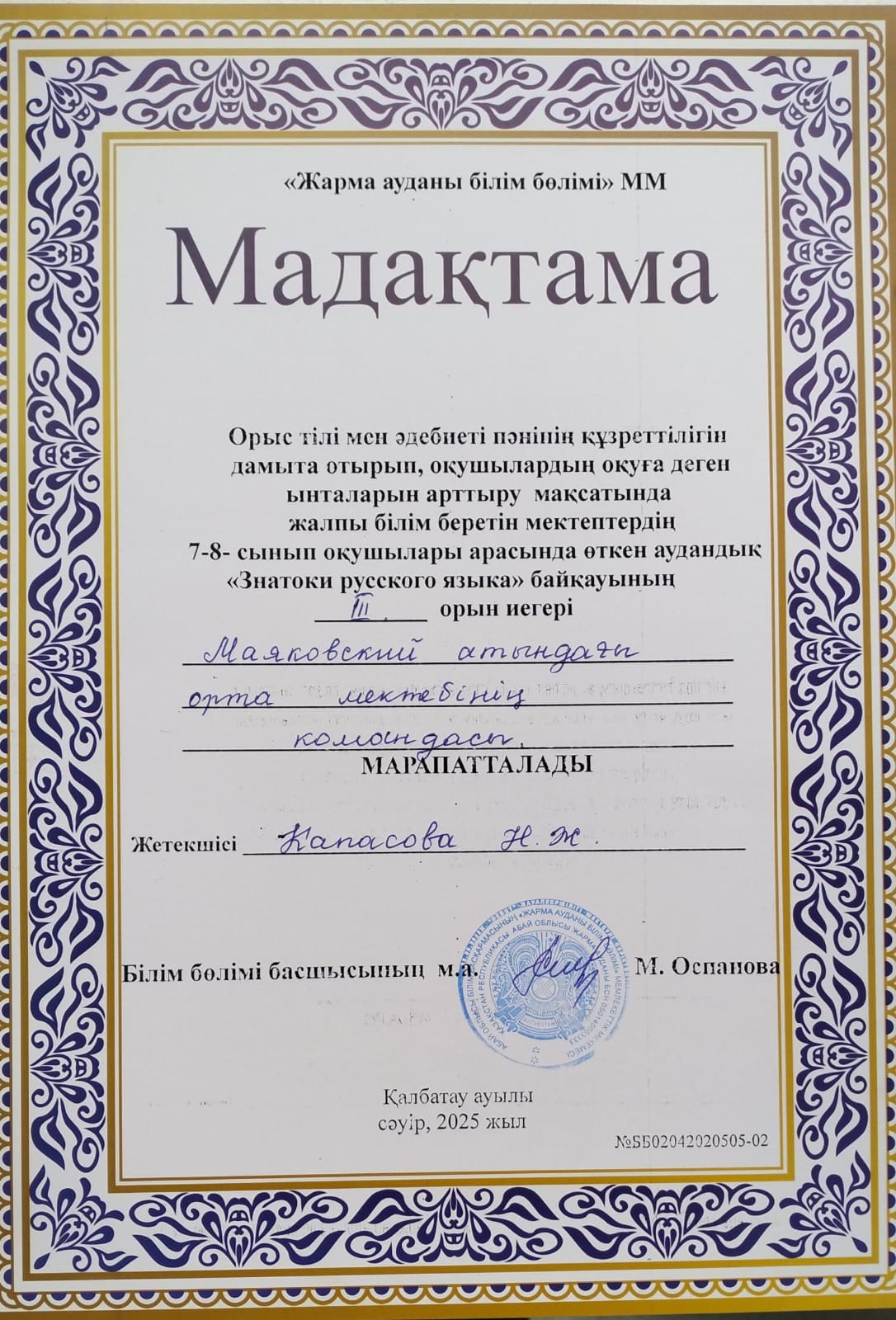 ✅2025 жылдың 2 сәуір күні орыс тілі мен әдебиеті пәнінің құзіреттілігін дамыта отырып, оқушылардың оқуға деген ынталарын арттыру мақсатында жалпы білім беретін мектептердің 7-8- сынып оқушылары арасында өткен аудандық "ЗНАТОКИ РУССКОГО ЯЗЫКА" байқауында мектебіміздің командасы жүлделі ІІІ-ші ОРЫНДЫ иеленді.