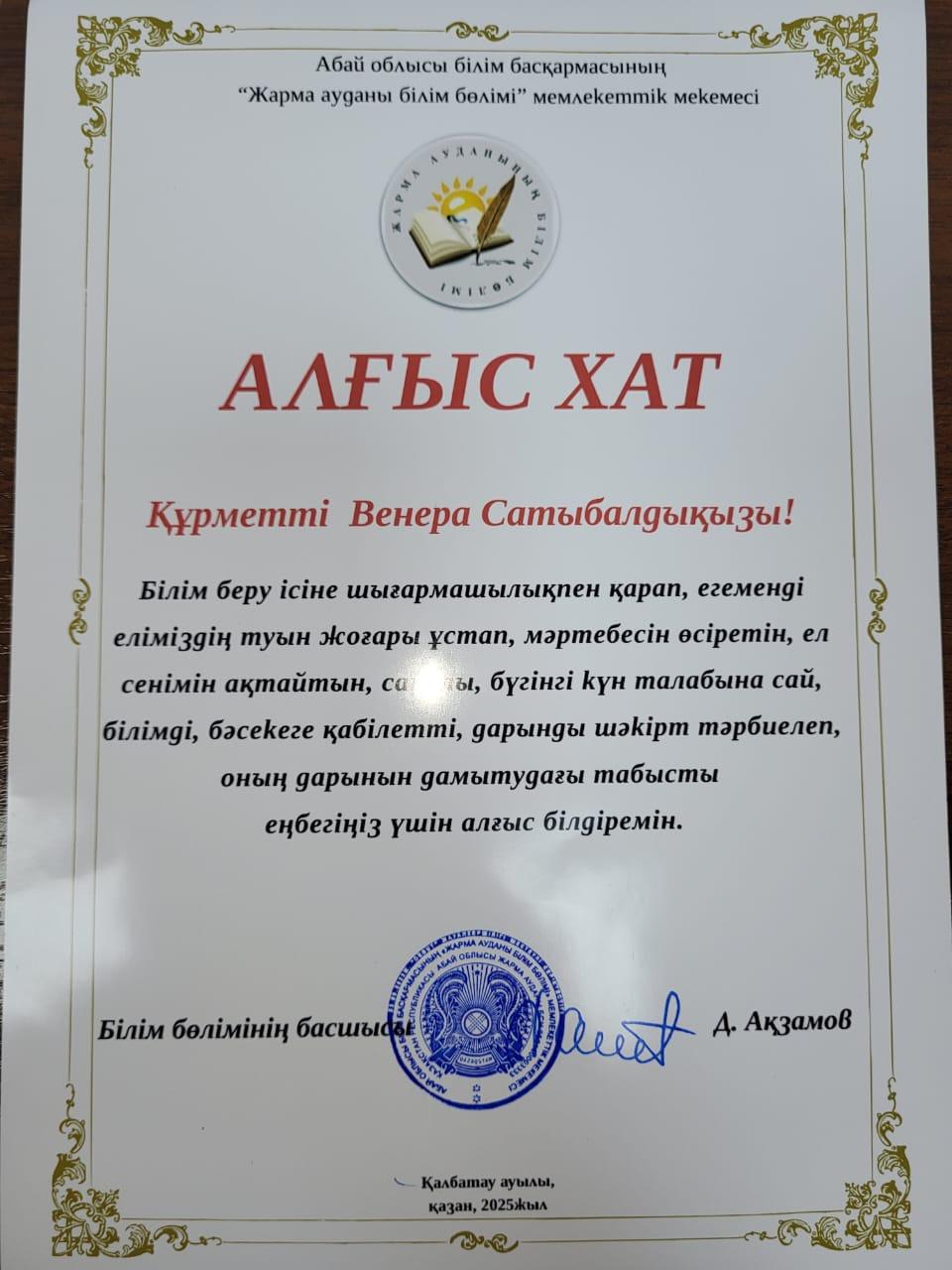 Білім беру ісіне шығармашылықпен қарап, егеменді еліміздің туын жоғары ұстап, мәртебесін өсіретін, саналы, білімді шәкірт тәрбиелегені үшін әріптесіміз ВЕНЕРА САТЫБАЛДЫҚЫЗЫ Жарма ауданы білім бөлімінің басшысы Д.АҚЗАМОВТЫҢ АЛҒЫС ХАТЫМЕН марапатталды.