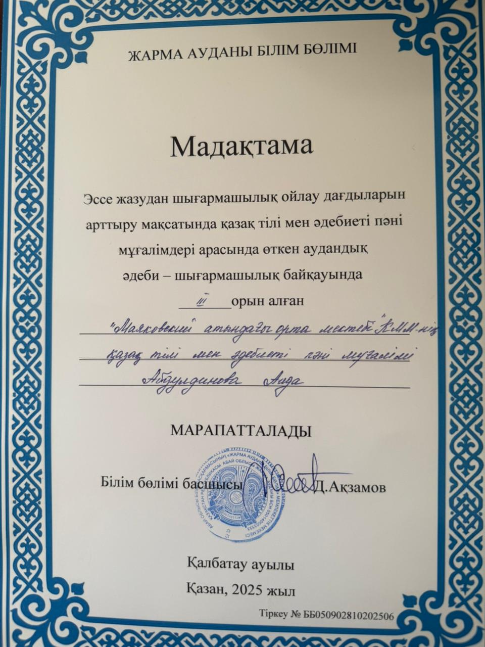✅ Қазақ тілі мен әдебиеті пәні мұғалімдерінің арасында эссе жазудан шығармашылық ойлау дағдыларын арттыру мақсатында өткен АУДАНДЫҚ әдеби-шығармашылық байқауында мектебіміздің қазақ тілі мен әдебиеті пәні мұғалімі