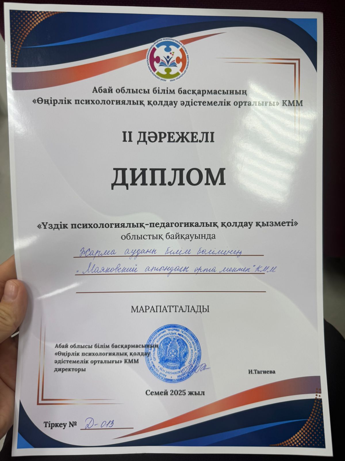 💟 Абай облысы білім басқармасының «Өнірлік психологиялық қолдау әдістемелік орталығы» ұйымдастырған ОБЛЫСТЫҚ «ҮЗДІК ПСИХОЛОГИЯЛЫҚ-ПЕДАГОГИКАЛЫҚ ҚОЛДАУ ҚЫЗМЕТІ» байқауында мектебіміздің жүлделі II ОРЫНҒА ие болып, дипломмен марапатталды.