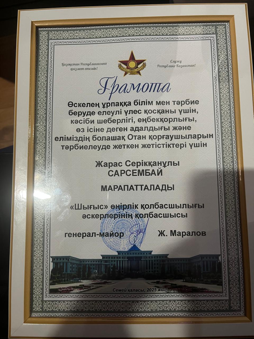 ✅ Өскелең ұрпаққа білім мен тәрбие беруде қосқан елеулі үлесі, кәсіби шеберлігі мен еңбексүйгіштігі, өз ісіне деген адалдығы үшін, сондай-ақ ел болашағы — Отан қорғаушыларын тәрбиелеудегі жетістіктері үшін «Шығыс» өңірлік қолбасшылығы әскерлерінің қолбасшысы, генерал-Майор Ж.Мараловтың алғыс Грамотасымен мектебіміздің алғашқы әскери дайындық пәні мұғалімі САРСЕМБАЙ ЖАРАС СЕРІКҚАНҰЛЫ марапатталды.