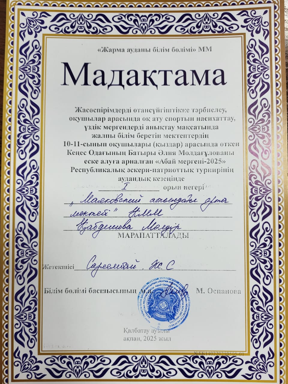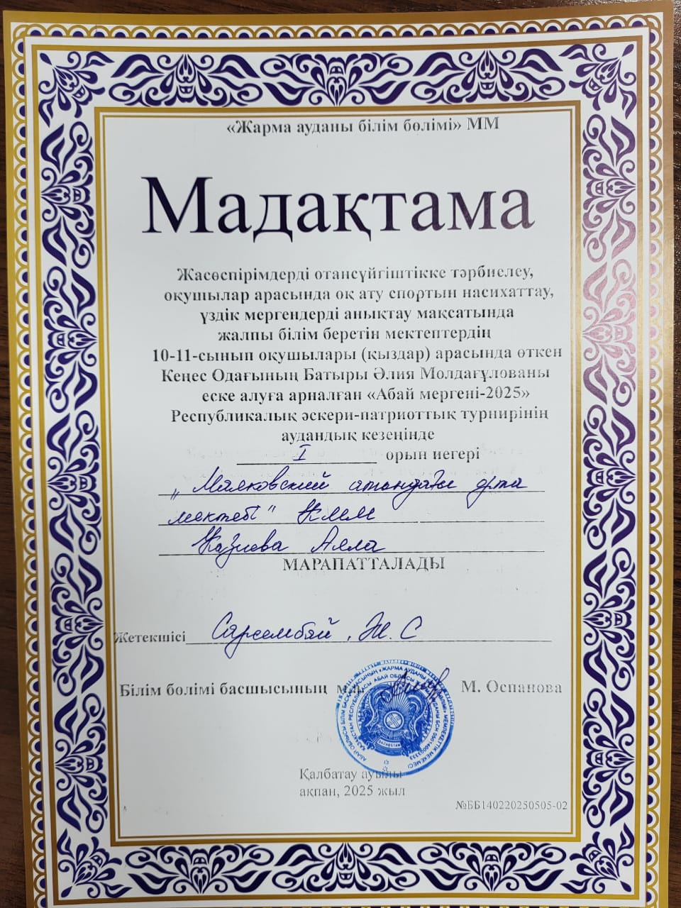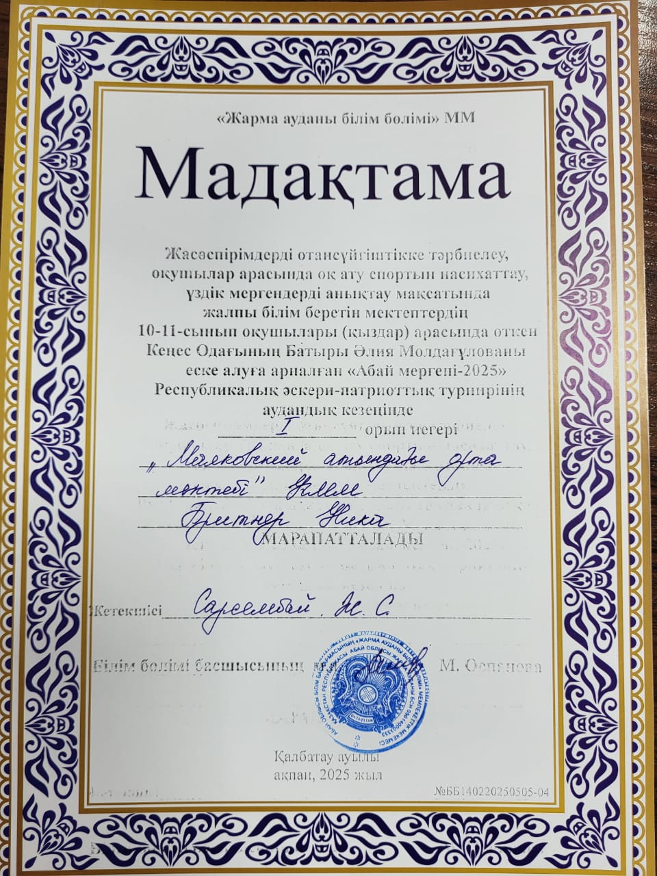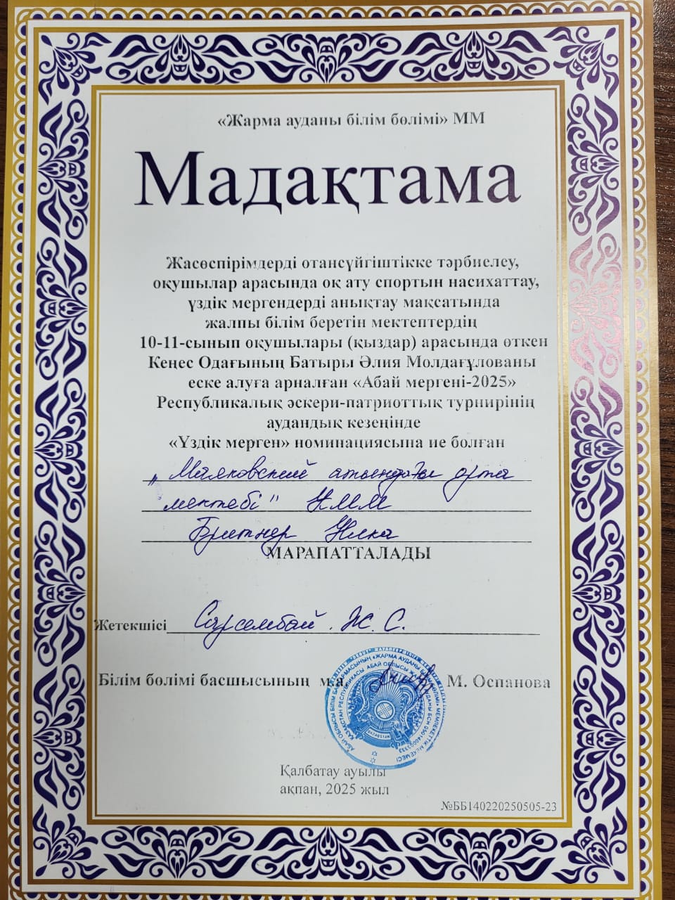 ✅Жасөспірімдерді отансүйгіштікке тәрбиелеу, оқушылар арасында оқ ату спортын насихаттау, үздік мергендерді анықтау мақсатында жалпы білім беретін мектептердің 10-11 сынып оқушы қыздар арасында өткен Кеңес Одағының Батыры ӘЛИЯ МОЛДАҒҰЛОВАНЫ еске алуға арналған «АБАЙ МЕРГЕНІ - 2025» РЕСПУБЛИКАЛЫҚ әскери-патриоттық турнирінің АУДАНДЫҚ кезеңінде мектебіміздің командасы жүлделі I ОРЫНДЫ иеленді.