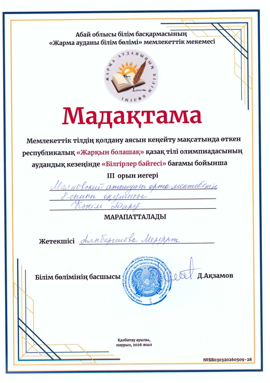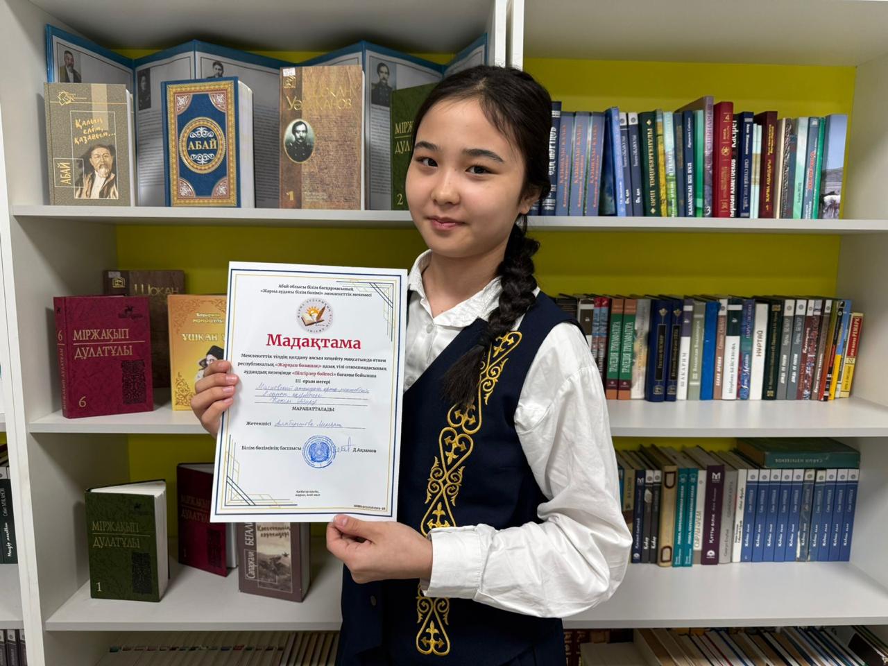 🔅в направлении «БІЛГІРЛЕР БӘЙГЕСІ» ученица 8 «Ә» класса КӘКІМ АЙАРУ заняла призовое ІIІ место.