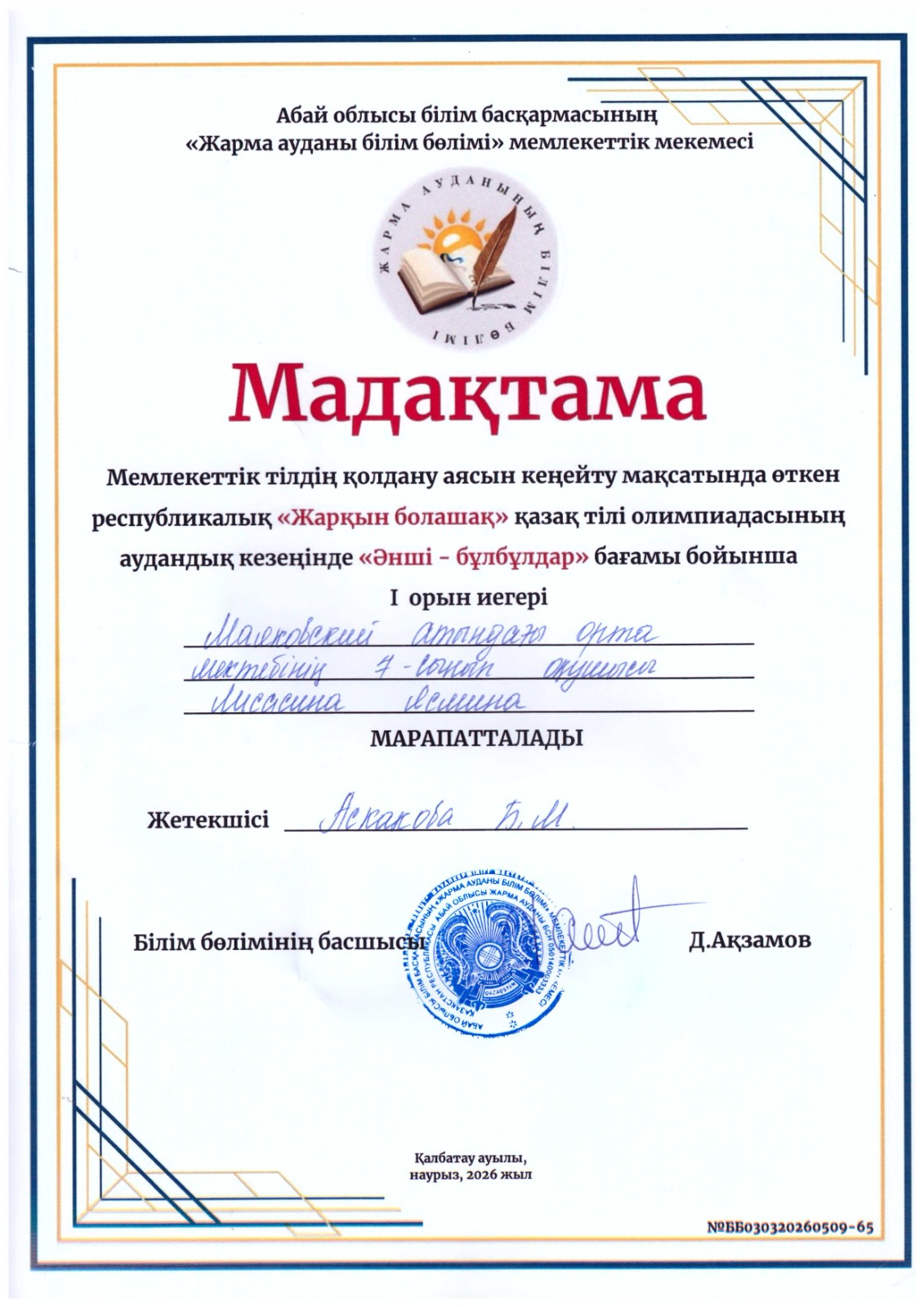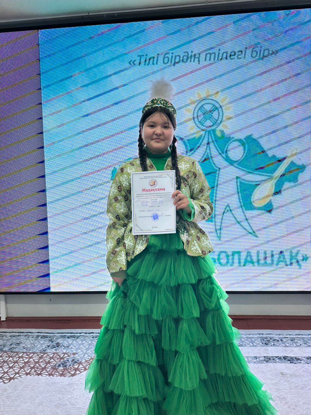 🔅в направлении «ӘНШІ-БҰЛБҰЛДАР» ученица 7 «Б» класса ЛИСАСИНА ЯСМИНА заняла призовое I место.