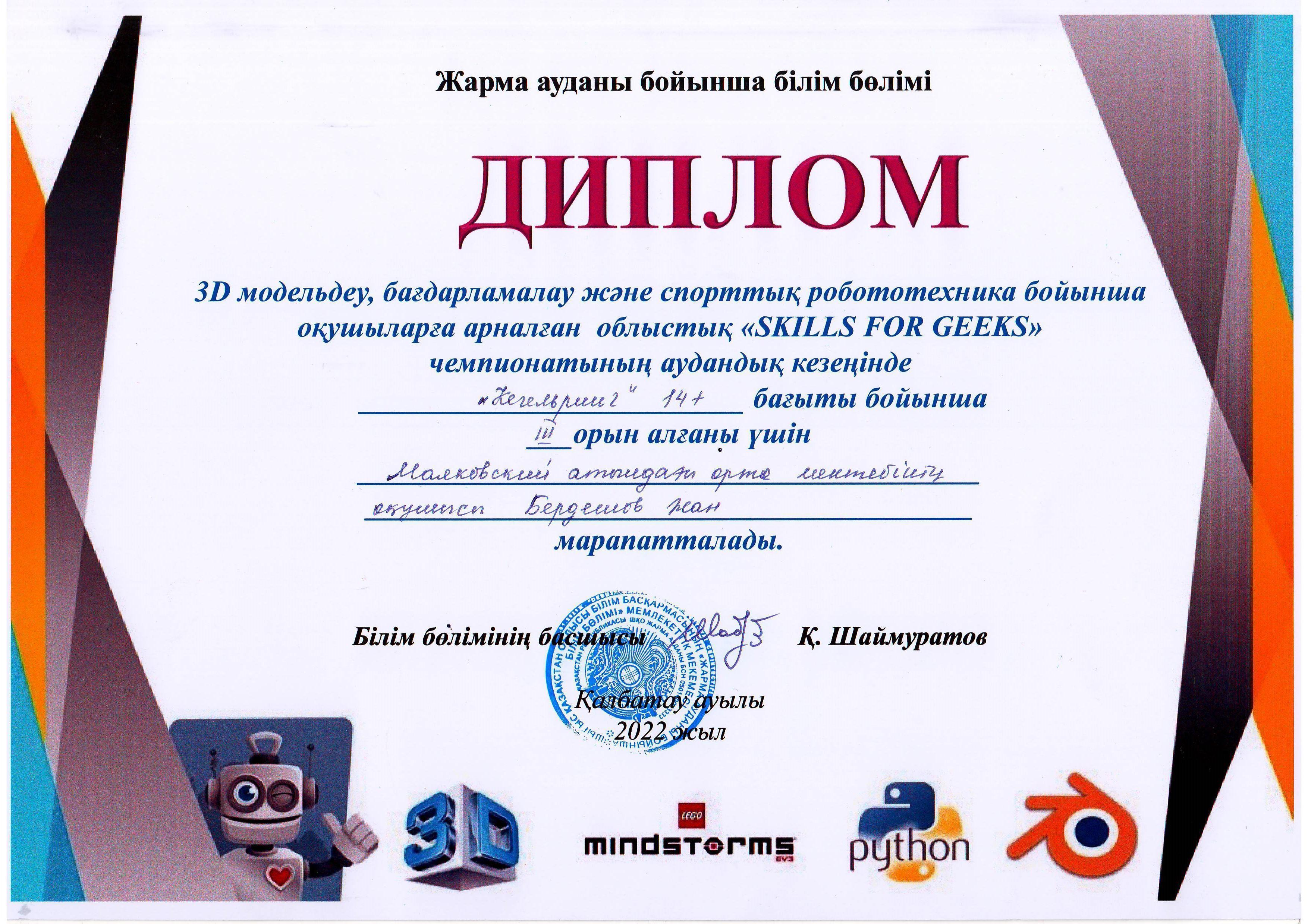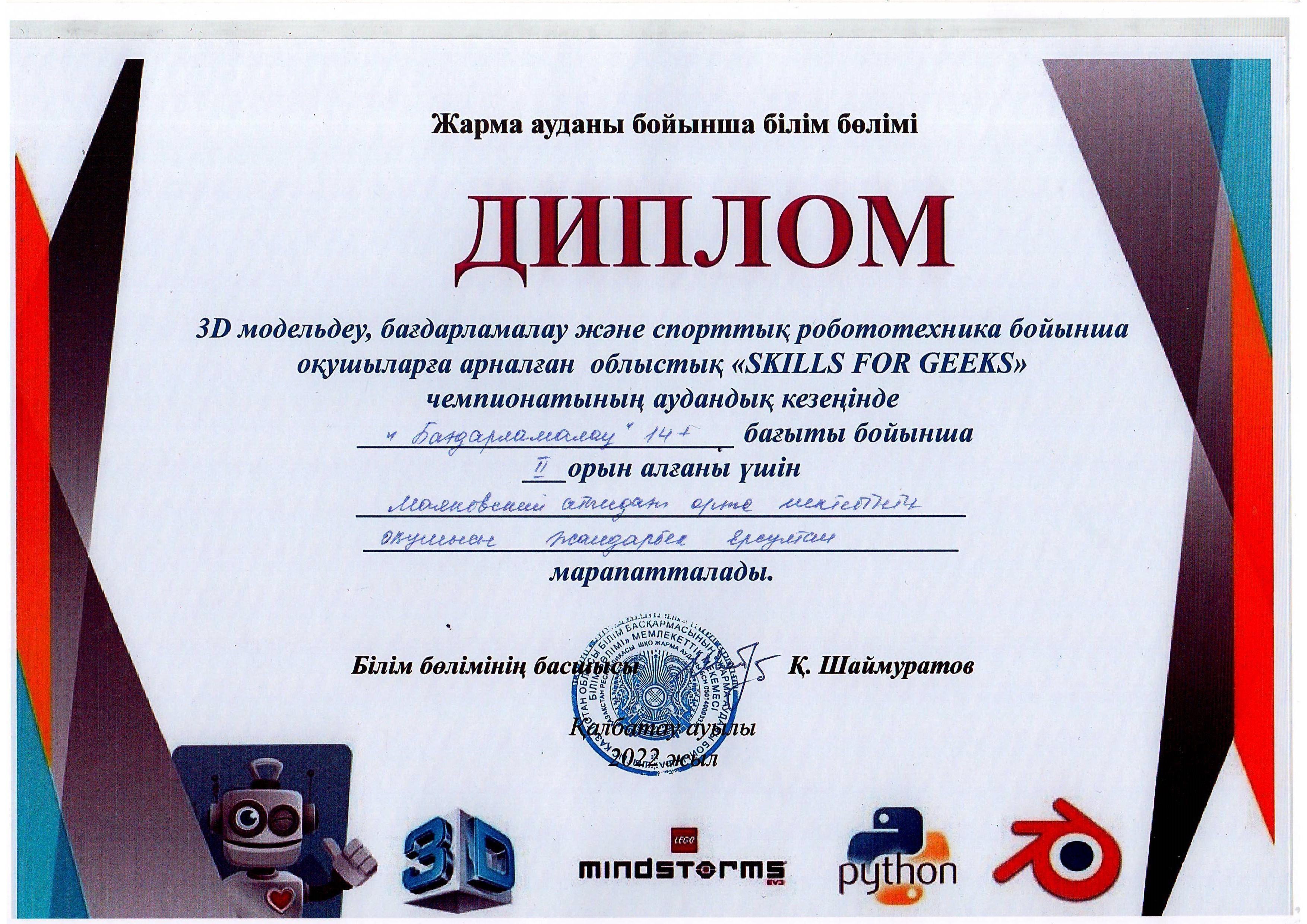 Сегодня 02.03.2021 года отделом образования по жарминскому району на районном этапе областного чемпионата «SKILLS FOR GEEKS» для школьников по 3D моделированию, программированию и робототехнике в командном зачете учащиеся КГУ «Средняя школа имени Маяковского» заняли ІІІ место и пополнили школьную копилку победой. Члены команды по направлению 14 + » Танковый биатлон "ученик 8 класса Бекбосын Ерзат ІІ место, по направлению «Сумо» +10 ученик 8 класса Токан Бекарыс III место, по направлению 14+» 3D моделирование" ученик 9 класса Ашимтаев Алинур ІІ место, по направлению 14+» Программирование "ученик 11 класса Жандарбек Ерсултан ІІ место, по направлению 10+» гонка по линии" ученик 6 класса Турсынхан Нурали ІІІ место, ученик 8 класса направления» Сумо «Токан Бекарыс ІІІ место, ученик 10 класса Аманжол Даулет ІІІ место, ученик 11 класса направления» Кегельринг " Бердешов Жан ІІІ место. Поздравляем победителей соревнований с победой!