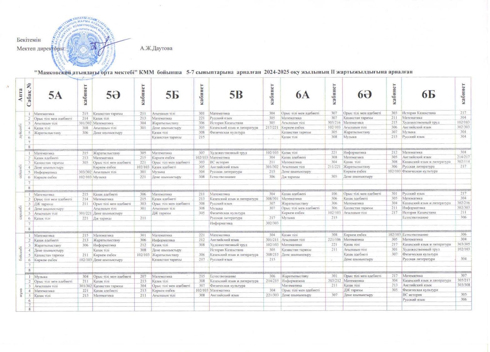 2024-2025 оқу жылының сабақ кестесі 2-жартыжылдык