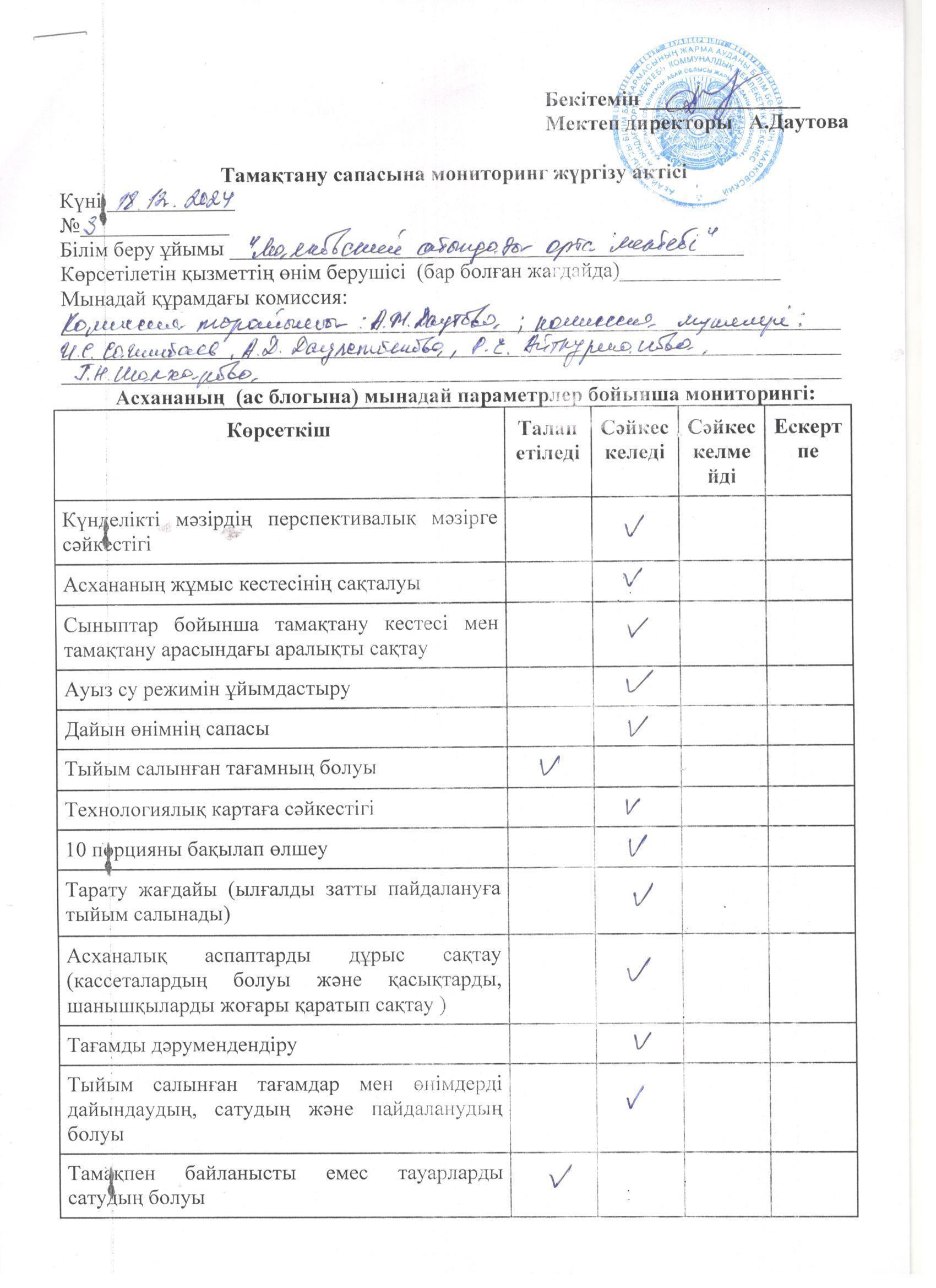 Тамақтану сапасына мониторинг жүргізу актісі