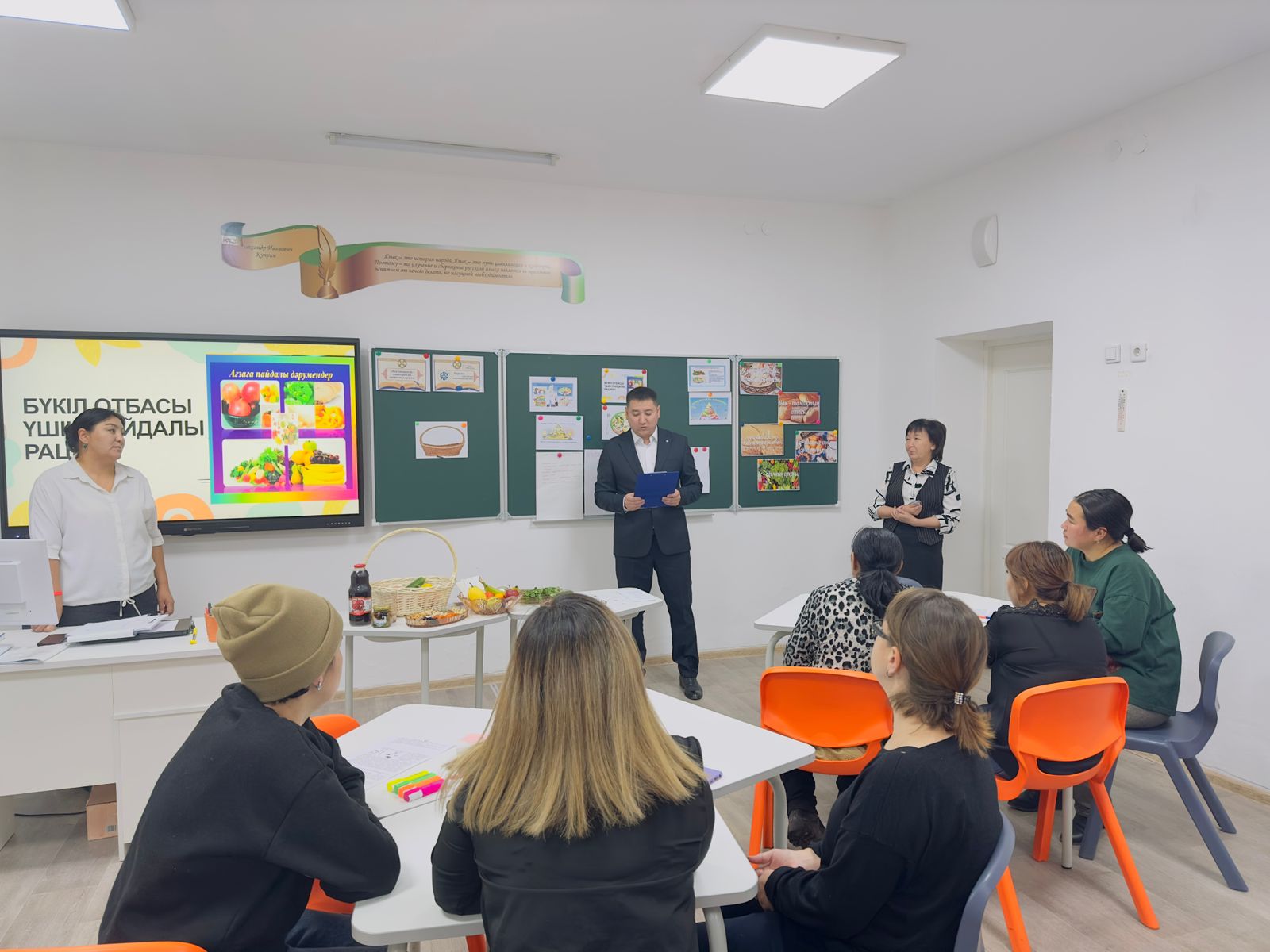 "Біртұтас тәрбие" бағдарламасы аясында "Ата аналарға педагогикалық қолдау орталығы" жұмыс жоспарына сай 6 - сынып жетекшілері Н.Ж. Капасова, Ж.С.Аканова, Е.Д.Тулегетаев сынып ата-аналарымен "Бүкіл отбасы үшін пайдалы рацион құру" тақырыбында сабақ өткізді. Ата-аналар белсенділікпен сұрақ жауап, постер, кластер, видео, анақтама, қызықты ойын топтық, жұптық, жеке жұмыстар жасады. Сабақ барысында "Бір күндік ас мәзірін құрастыру", "Тәрелкені толтыр", "Ауырып, шаршап тұрған баланы емдеу", "Судың адам ағзасына пайдасы" тапсырмаларын орындап, жұмыстарын тамаша қорғады. Ата-аналар өздеріне қажет ақпараттар алып, кері байланыс жасап, тілектірін білдірді.