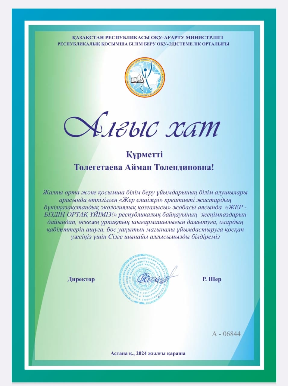 Жалпы орта және қосымша білім беру ұйымдарының білім алушылары арасында өткізілген "Жер елшілері" креативті жастардың БҮКІЛҚАЗАҚСТАНДЫҚ экологиялық қозғалысы жобасы аясында "Жер-біздің ортақ үйіміз" РЕСПУБЛИКАЛЫҚ байқауына мектебіміздің 3 "Ә" сынып оқушысы Рысбек Раяна қатысып жүлделі III - орынға ие болды.