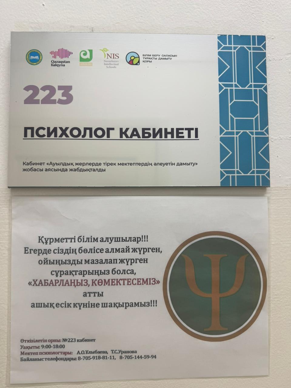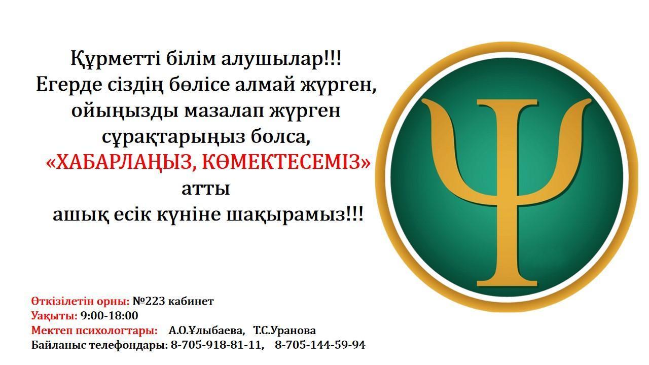 2 желтоқсан күні “Зорлық зомбылықсыз 16 күн” акциясы аясында мектеп психологтары А.О. Ұлыбаева мен Т.С.Уранованың ұйымдастыруымен “Хабарлаңыз, көмектесеміз” атты ашық есік күні өткізілді. Ашық есік күні білім алушылар ерікті түрде мектеп психологтарымен жұмыс жасай отырып, өз көңіл-күйлерімен, алаңдатып жүрген сұрақтар төңірегінде бөлісе алды.