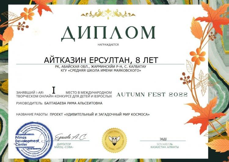 Бастауыш сынып мұғалімі Рима Алсейітқызы мен оның оқушысы Айтқазин Ерсұлтан "Ғарыштың ғажайып және жұмбақ әлемі" жобасымен екінші жыл жұмыс істеп, өз жұмыстарымен #centrsova_kz ұйымдастырған ғылыми жобалардың халықаралық онлайн - конкурсына қатысып, 1 орынға ие болды. Рима Алсейітқызы мен Ерсұлтанды құттықтаймыз!!! Көптеген жеңістер болсын!!!!