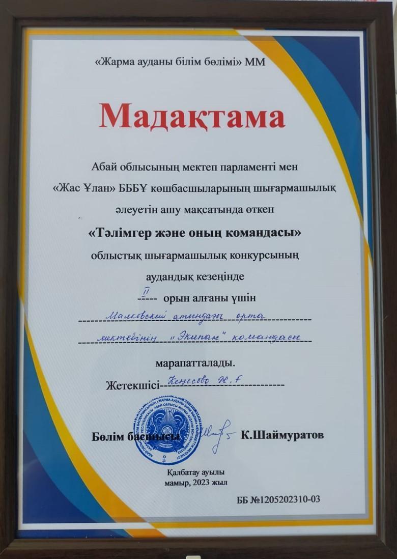 Жарма ауданы білім бөлімінің ұйымдастыруымен Абай облысының мектеп парламенті мен «Жас Ұлан» БББҰ көшбасшыларының шығармашылық әулиетін ашу мақсатында өткен «Тәлімгер және оның командасы» облыстық шығармашылық конкурсының аудандық кезеңіне мектеп тәлімгері Ж.Ғ.Кеңесова және «Экипаж» командасы (мүшелері: А.Оралтаева, З.Еркимбекова, А.Айбекқызы, А.Асланқызы, Д.Бекқазы, М.Хабибуллин) қатысып, жүлделі ІІ-орынды иеленді. Жеңімпаздарымызды жеңістерімен құттықтаймыз!