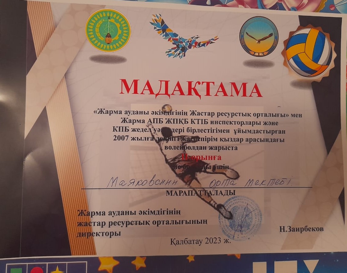 "Жарма ауданы әкімдігінің Жастар ресурстық орталығы" мен Жарма АПБ ЖПҚБ КТІБ инспекторы және КПБ жедел уәкілдері бірлестігімен ұйымдастырылған 2007 жылға дейінгі жасөспірім қаздар арасында өткен волейболдан аудандық жарыста Маяковский атындағы орта мектебінің қыздары жүлделі 2- орынға ие болды.Дәл осы жарыста "Үздік тосқауылшы" номинациясымен Сансызбаева Элина марапатталса, "Үздік байланыстырушы" номинациясымен Болатбекова Аружан марапатталды.Жеңімпаздарды жүлделі орындарымен құттықтаймыз!!!