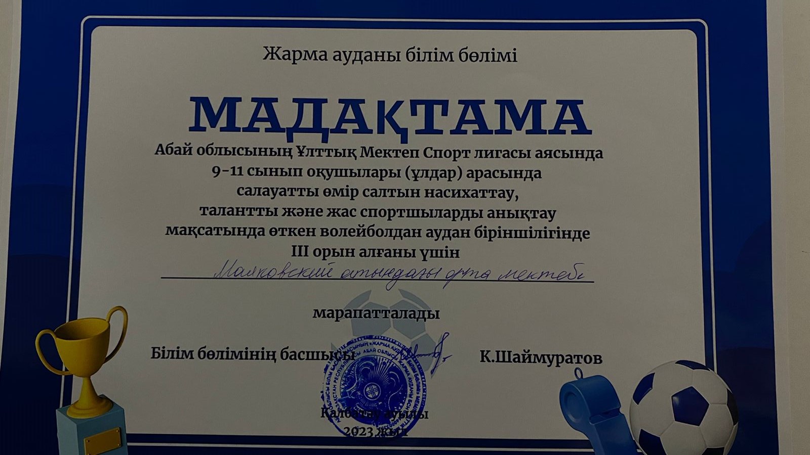 Жарма ауданы білім бөлімінің ұйымдастыруымен Абай облысының Ұлттық Мектеп Спорт лигасы аясында 9-11 сынып қыздар және ұлдар арасында салауатты өмір салтын насихаттау, талантты және жас спортшыларды анықтау мақсатында волейболдан өткен аудан біріншілігінде мектебіміздің командасы жүлделі ІІІ-орынға ие болды. Жетекшілері: Базанов Н.Е. Таширяев Е.С. Тюлегетаев Е.Д. Жеңімпаздарды құттықтаймыз!!!