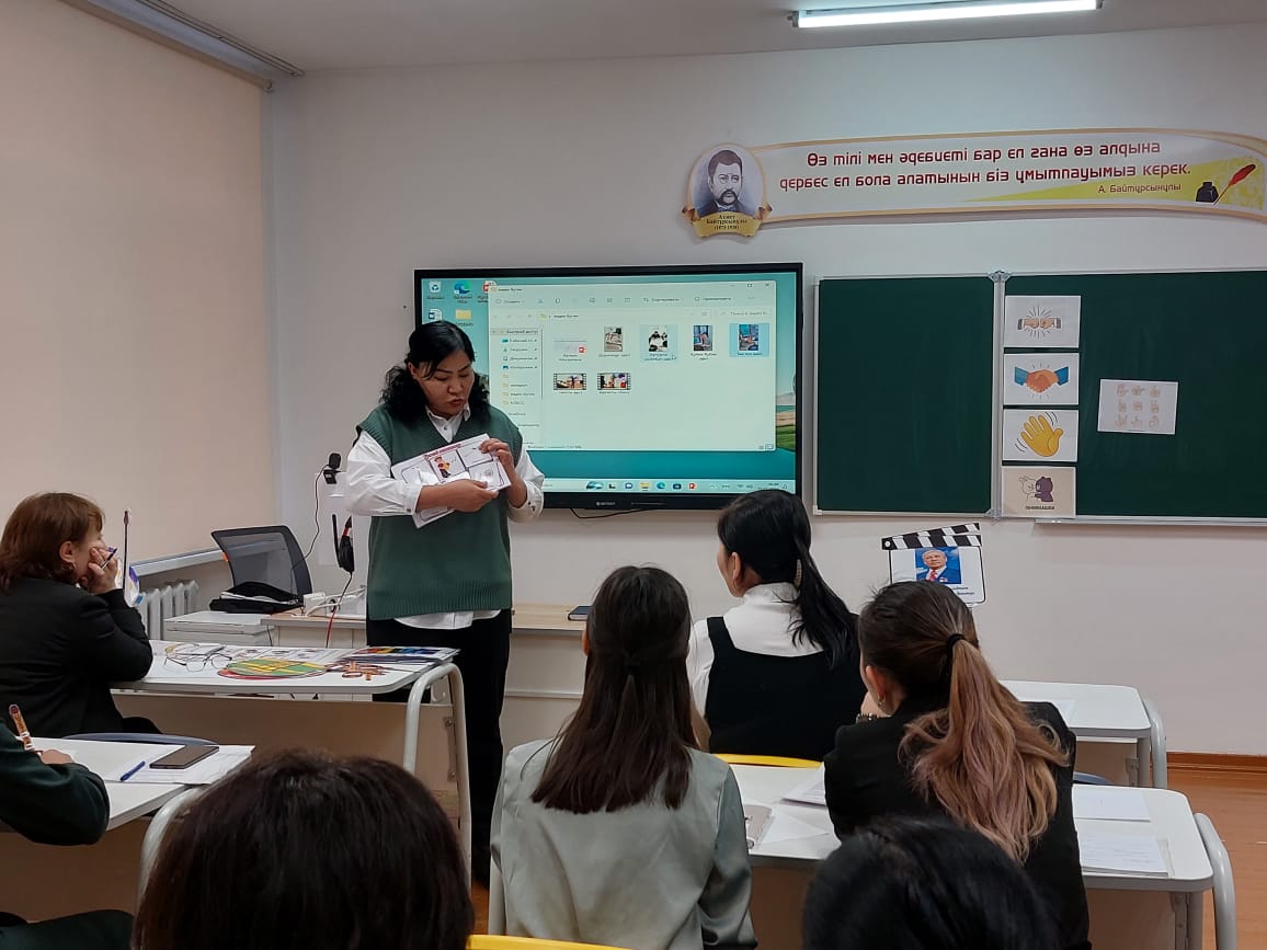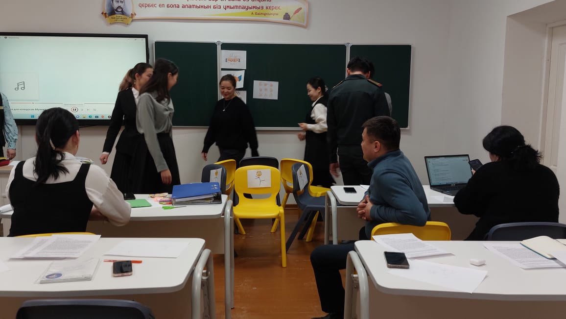 "Белсенді оқыту әдістерін қолдану" педагог-зерттеуші, қазақ тілі және әдебиеті пәні мұғалімі Байнуркашева С.Г., "Сабақты ұйымдастыру стратегиясы" педагог-психолог Ұлыбаева А.О.
