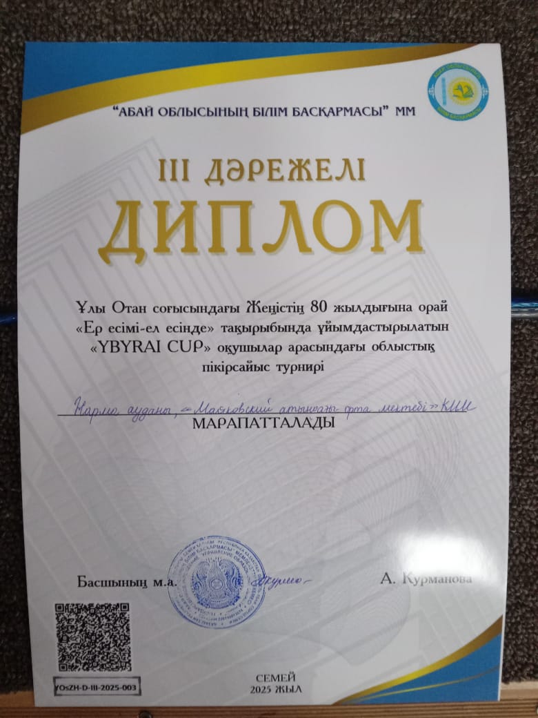 ✅В областном дебатном турнире среди учащихся «YBYRAI CUP», посвящённом 80-летию Победы, дебатный клуб нашей школы «ЖАС ҚЫРАН» занял призовое III МЕСТО.
