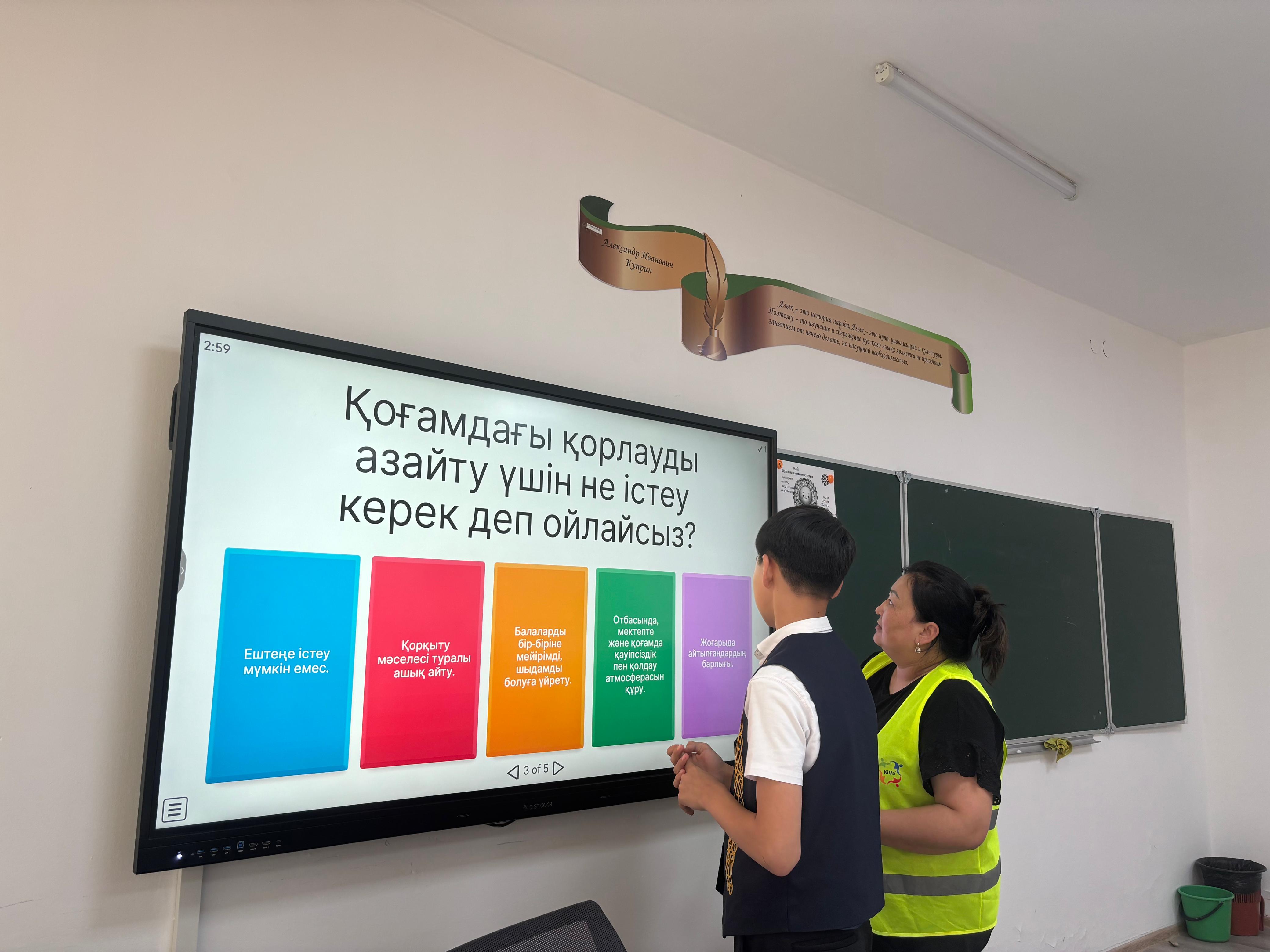 • Буллинг ұғымымен және оның түрлерімен танысты;• Қиын жағдайларға байланысты мысалдарды талқылады;• Басқаларға қолдау көрсету жолдарын үйренді;• Топтық жұмыс пен рөлдік ойындар арқылы мәселелерді шешуді тәжірибеден өткізді.✅Оқушылар белсенділік танытып, өз ойларымен еркін бөлісті. Олар бір-біріне көмек көрсету мен достық қарым-қатынастың маңызын түсініп, буллингке қарсы тұру жолдарын меңгерді.
