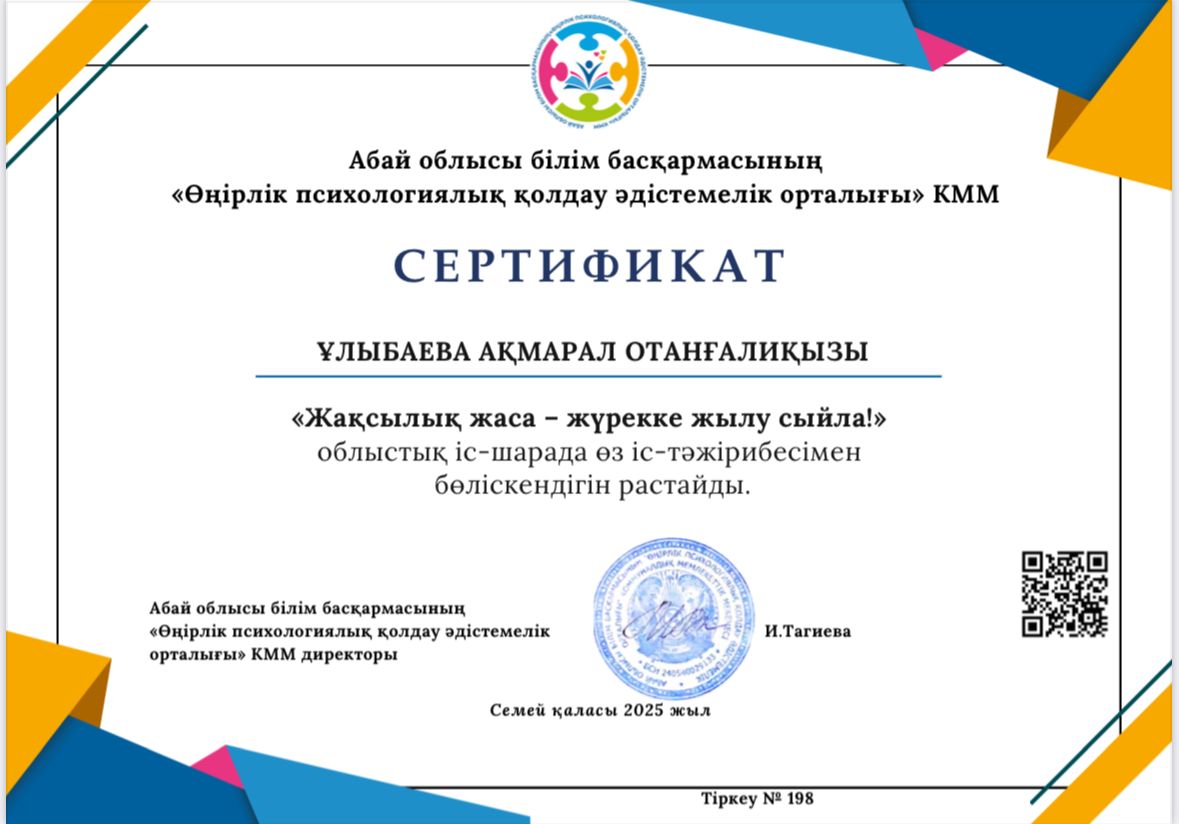➡️ Абай облысының Өңірлік психологиялық қолдау әдістемелік орталығының бастамасымен мектебіміздің педагог-психологы ҰЛЫБАЕВА АҚМАРАЛ ОТАНҒАЛИҚЫЗЫ «Жасыл ел» жасақтарына арналған “ЖАҚСЫЛЫҚ ЖАСА-ЖҮРЕКТЕРДІ ЖЫЛЫТ!” атты психологиялық тренинг акциясына қатысып, өз іс-тәжірибесімен бөлісті.