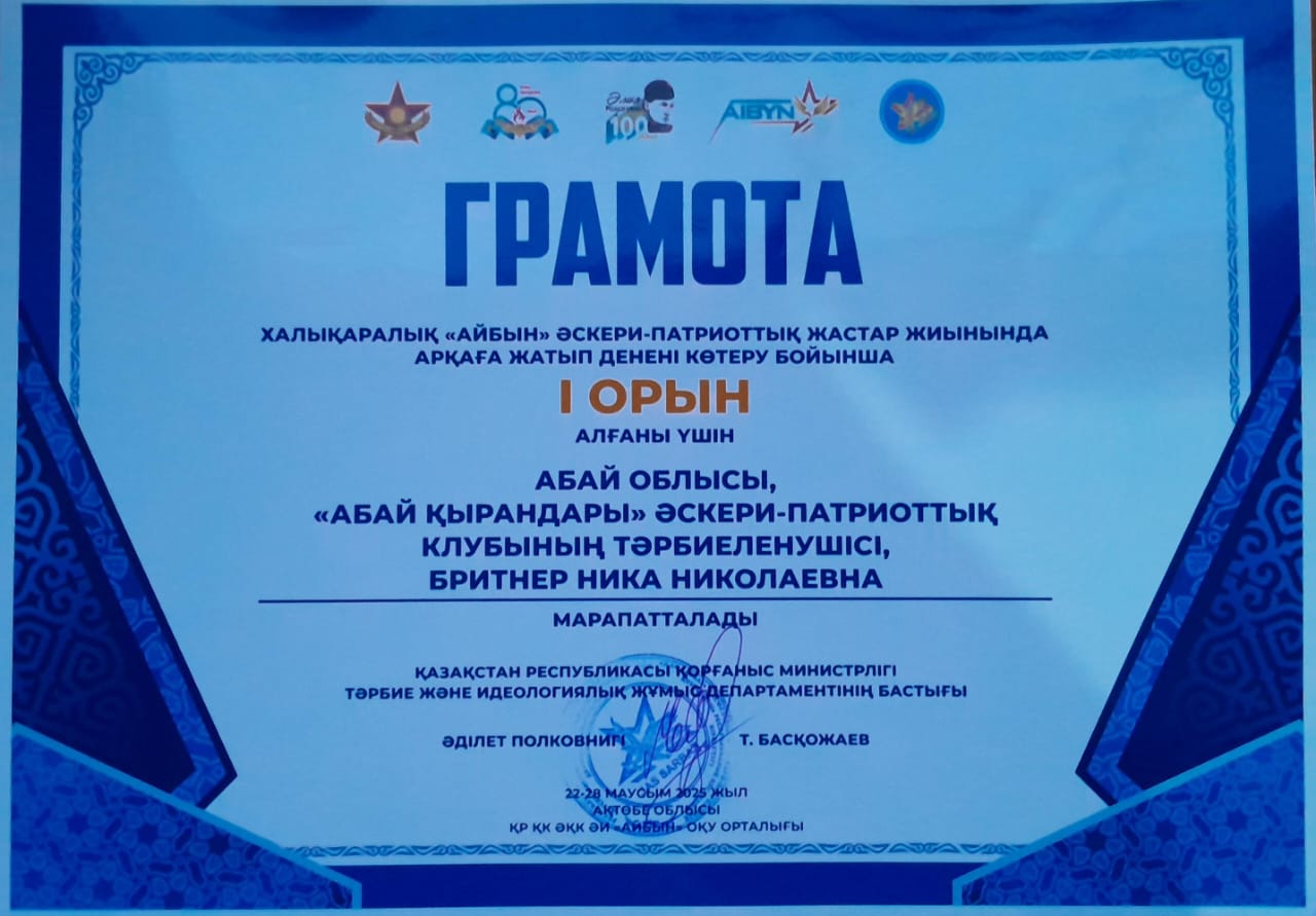 🥇2025 жылдың 22-24 маусымы аралығында Ақтөбе облысының «Хлебодаровка» оқу жаттығу орталығында Ұлы Жеңістің 80 жылыдығына және Кеңес Одағының батыры Әлия Молдағұлованың 100 жылдығына арналған XI ХАЛЫҚАРАЛЫҚ «АЙБЫН» әскери-патриоттық жастар жиыны өтті.