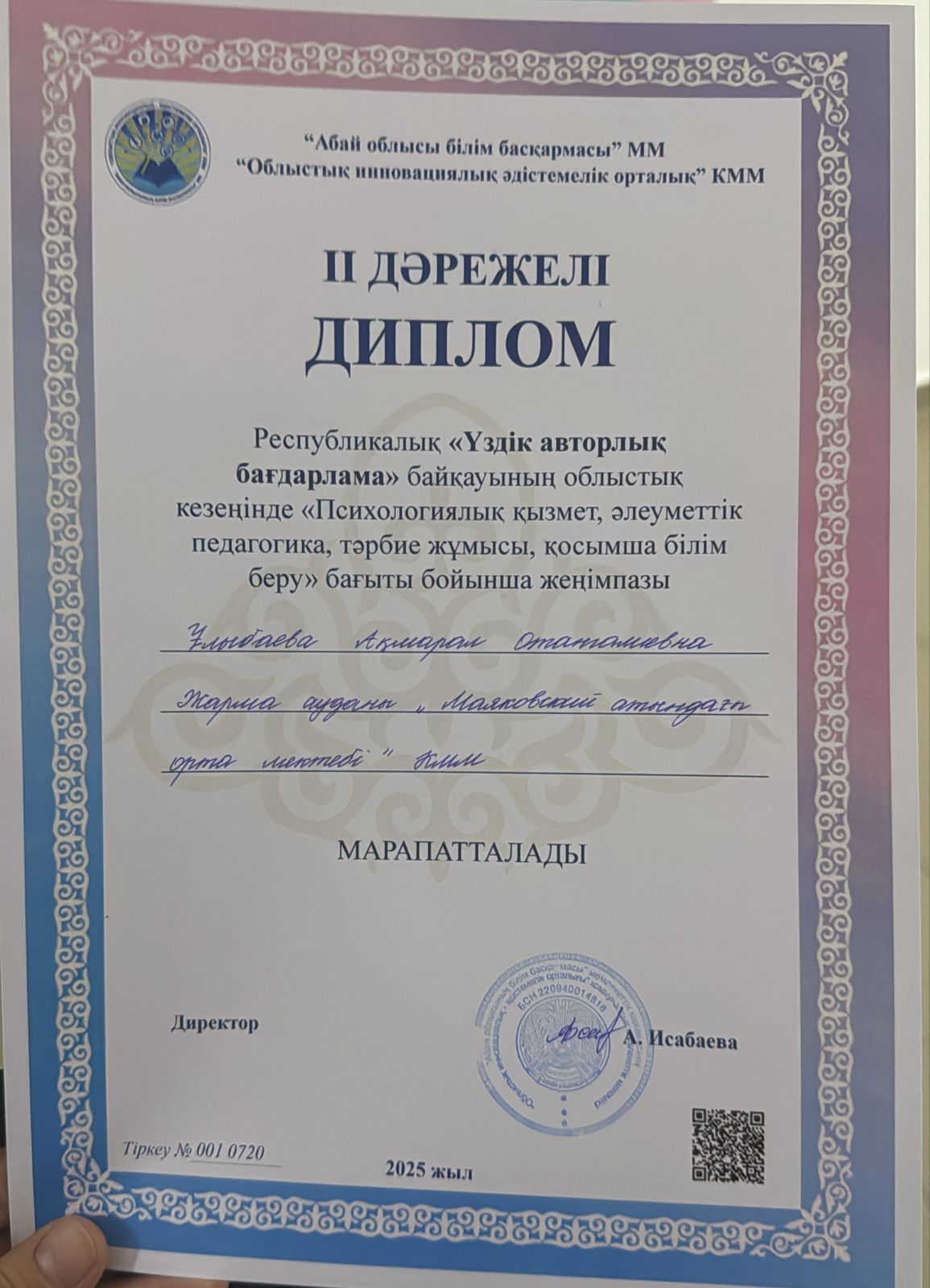 ✅Республикалық «Үздік авторлық бағдарлама» байқауының ОБЛЫСТЫҚ кезеңінде «Психологиялық қызмет, әлеуметтік педагогика, тәрбие жұмысы, қосымша білім беру» бағыты бойынша мектебіміздің психологі ҰЛЫБАЕВА АҚМАРАЛ ОТАНҒАЛИҚЫЗЫ жүлделі ІІ ОРЫНДЫ иеленді.