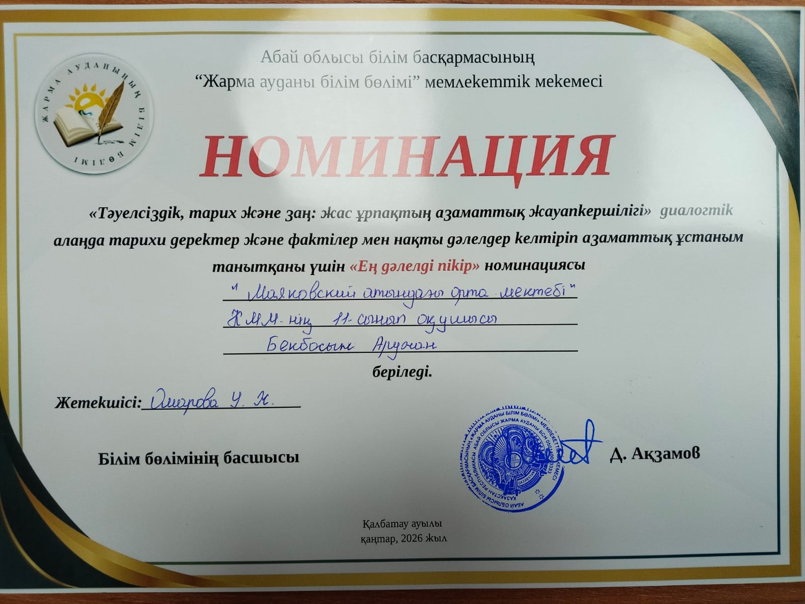 ✅ «Тәуелсіздік, тарих және заң: жас ұрпақтың азаматтық жауапкершілігі» тақырыбында өткен АУДАНДЫҚ диалогтік алаңда тарихи деректер және фактілер және мен нақты дәлелдер келтіріп азаматтық ұстаным танытқаны үшін мектебіміздің 11 «А» сынып оқушысы БЕКБОСЫН АРУЖАН «ЕҢ ДӘЛЕЛДІ ПІКІР» номинациясымен марапатталды.