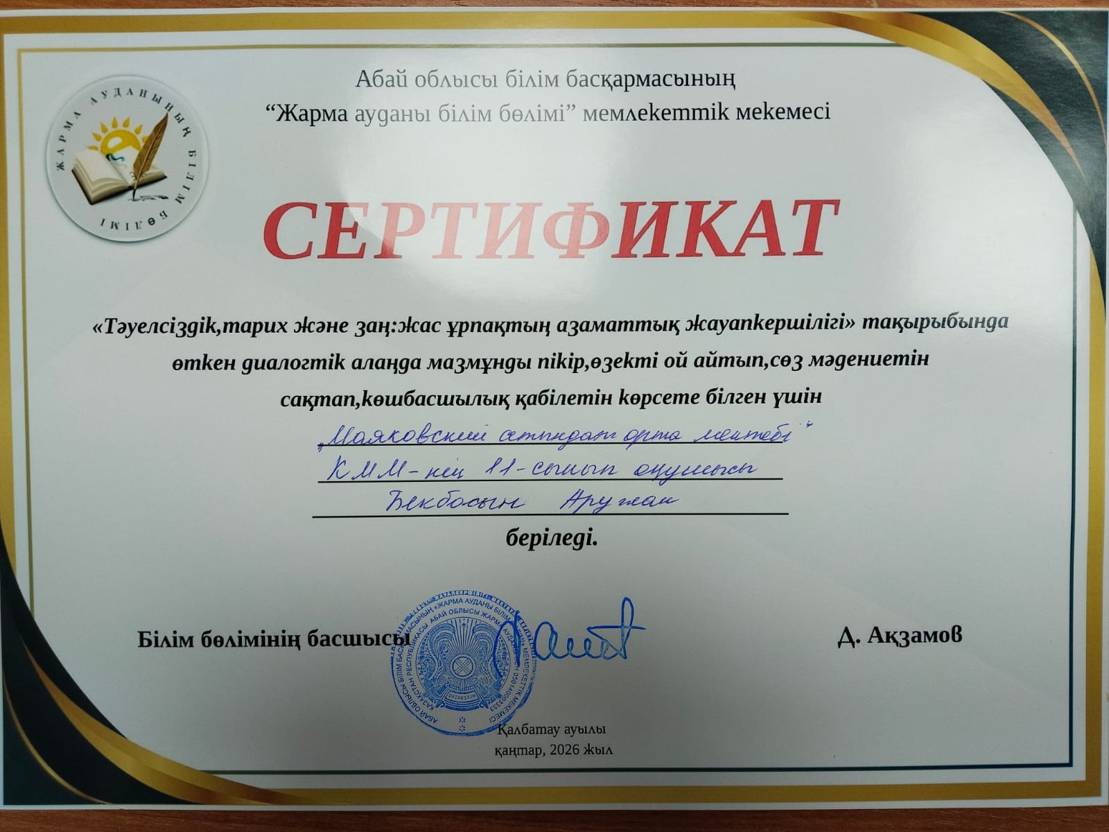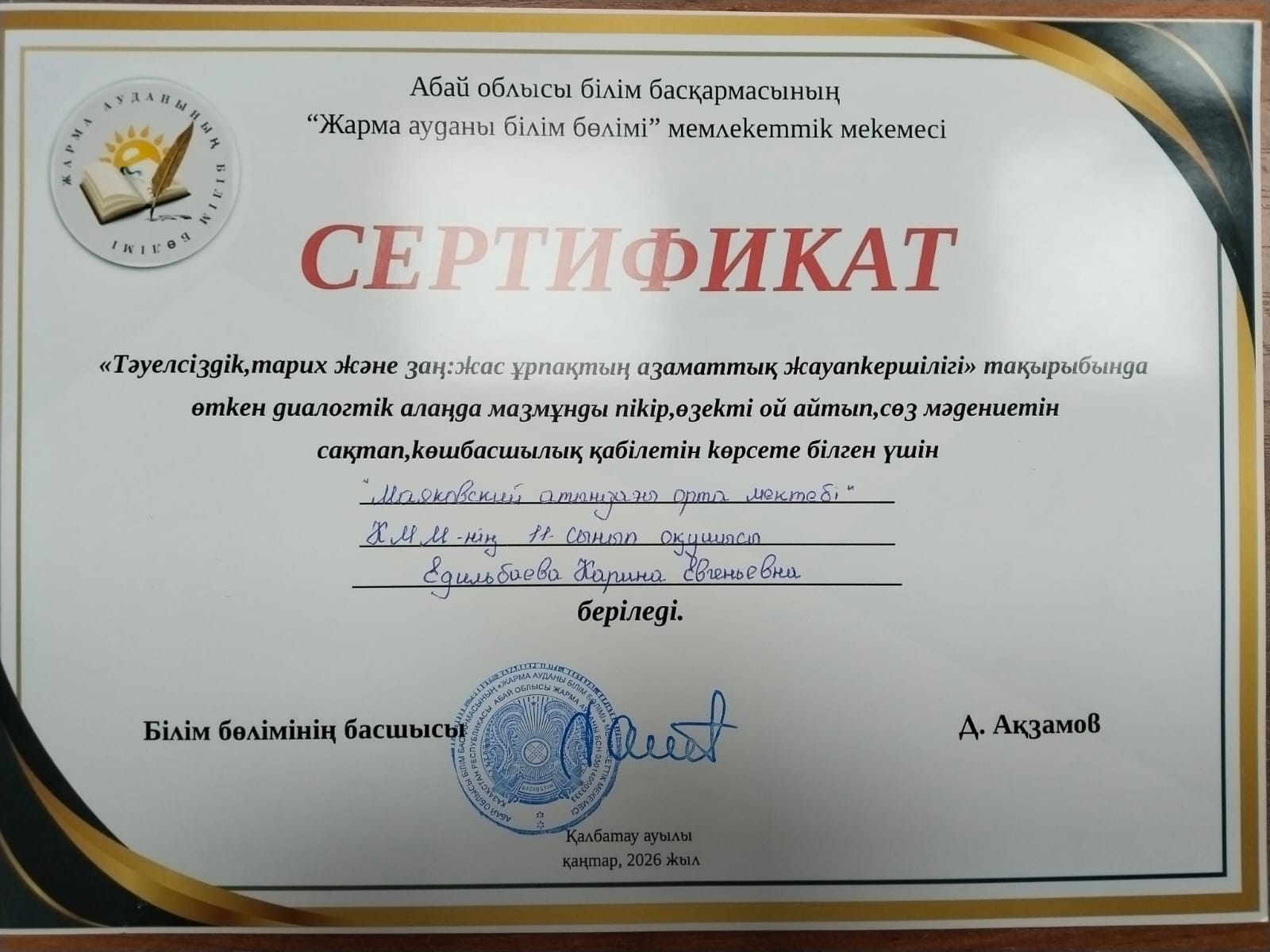 ✅ «Тәуелсіздік, тарих және заң: жас ұрпақтың азаматтық жауапкершілігі» тақырыбында өткен АУДАНДЫҚ диалогтік алаңда мазмұнды пікір, өзекті ой айтып, сөз мәдениетін сақтап, көшбасшылық қабілетін көрсете білгені үшін мектебіміздің 11 «А» сынып оқушысы БЕКБОСЫН АРУЖАН, 11 «Б» сынып оқушысы ЕДИЛЬБАЕВА КАРИНАҒА СЕРТИФИКАТ табысталды.