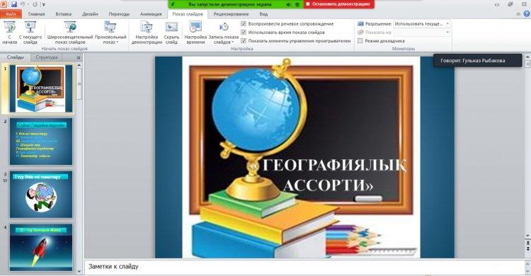 26 қараша күні «Маяковский атындағы орта мектебі» КММ – нің 11 «Ә» сынып оқушылары арасында «Географиялық ассорти» атты ойын сайысы өтті. Бұл ойын «Шығармашылық ізденіс – кәсіби шеберлік негізі» факультативтік қашықтық сабақтар апталығы аясында өтті. Ойынның негізгі мақсаты: оқушылардың осы пәннен алған білімдерін сынау, сонымен қатар ойлау, топпен жұмыс жасау дағдыларын қалыптастырып, одан әрі білімдерін жетілдіру; «жүзден жүйрік, мыңнан тұлпар» озып шығып, «Жас географтар» атағын алатын оқушыларды анықтау.