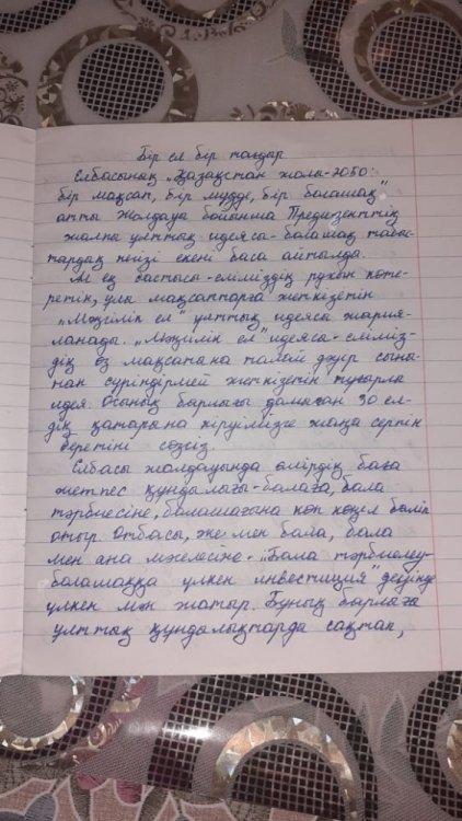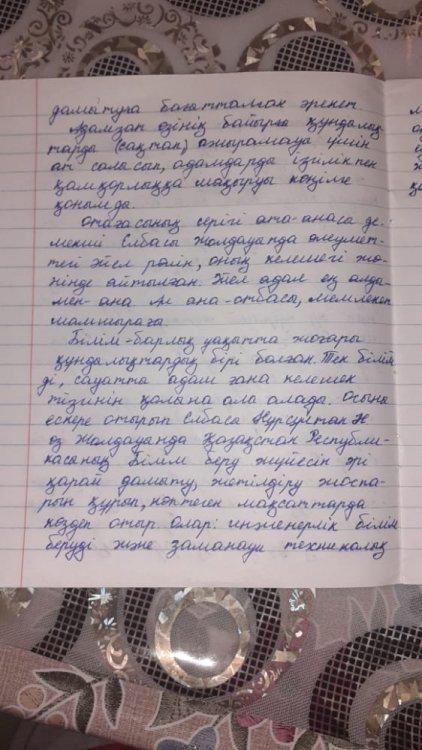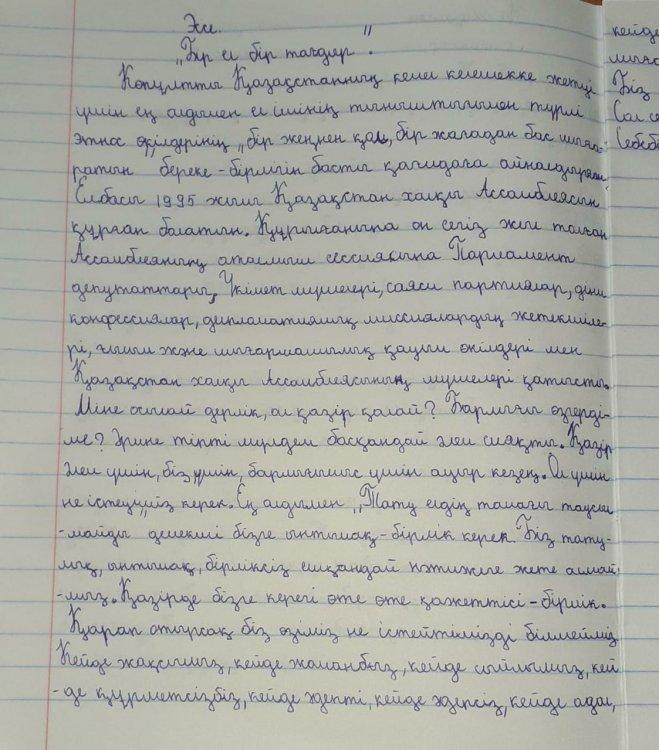 «Отанды сүю – біздің перзенттік парызымыз, қарыс қадам үшінжанын қиған бабалардың асыл аманатына адалдығымыз!»,- деп Тұңғыш Президентіміз айтқандай, ұрпақ бойындағы еліне деген патриоттық сезімдерін ояту, ел тағдырына жүректері селт ететін Азаматты тәрбиелеу бүгінгі күннің өзекті мәселесі болып отыр. Осыған орай, қараша айының 24 жұлдызында 9-11 сынып оқушылар арасында «Бір ел, бір тағдыр» тақырыбында эсселер сайысы өткізілді. Әр сыныптан өз ойын ортаға салғысы келген оқушылар аз болмады. Қазақша, орысша, ағылшынша жазылған эсселердің өзіндік ортақ ойы қағаз бетіне түсірілді. Жүзден жүйрік шыққан, тың ойлары мен жаңашыл көзқарастарын еркін білдіре білген оқушыларымыз бағаланып, марапатталды.