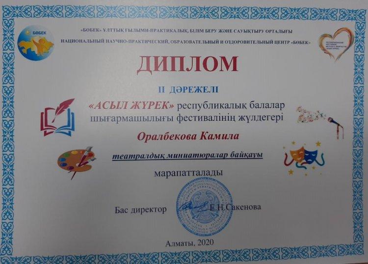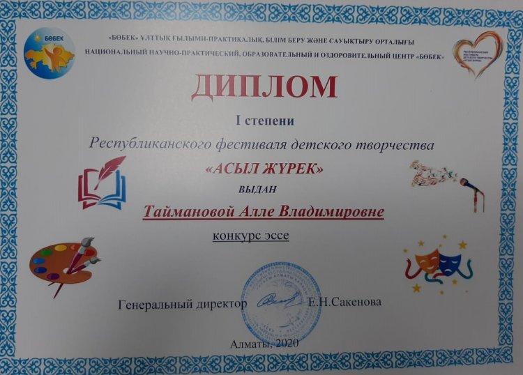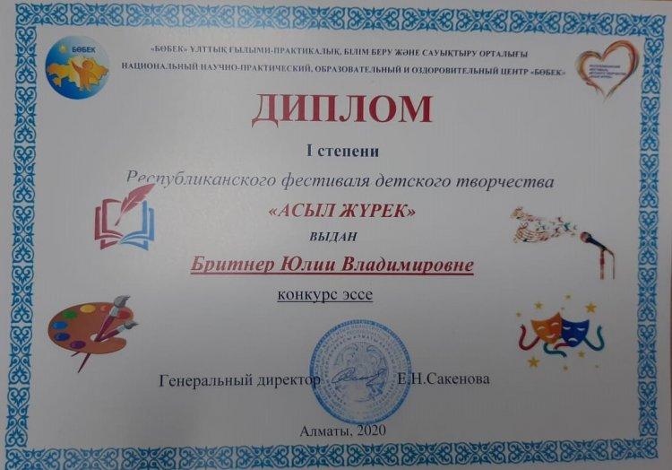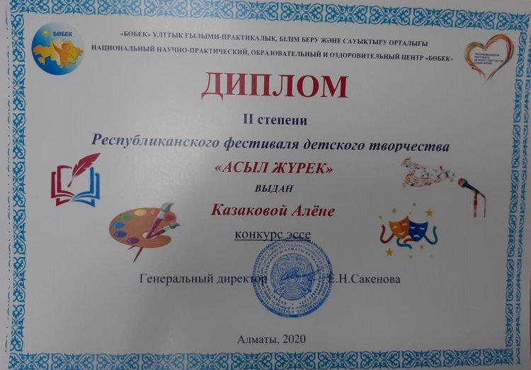 Дипломом 1 степени награждены: ученица 2 класса Бритнер Юлия, родительница Тайманова Алла Владимировна. Дипломами 2 степени награждены: ученица 3 класса Оралбекова Камила, ученица 10 класса Казакова Алёна. Дипломами за подготовку участников Республиканского фестиваля детского творчества "Асыл жүрек" педагоги Скрипко Татьяна Николаевна, Есентаева Кундыз Токтауовна, Кабдуалиева Гульнара Кумарбековна, Тайманова Алла Владимировна.