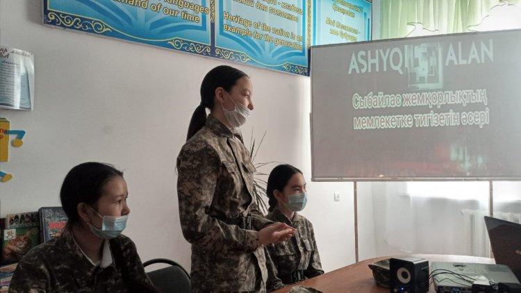 Мектептегі «Адал ұрпақ» клубының жылдық жоспарына сәйкес (жетекшісі Е.Т.Сапаш) Сыбайлас жемқорлықтың мемлекетке тигізетін әсері» тақырыбында өткен іс-шараға «JARMA-adaldyq alany» кеңсесінің жетекшісі К.Н.Тулеубаева арнайы келіп қатысты. Пікірталас барысында көрсетілген видеороликтердегі «теріс» деп тапқан тұстарды сынға ала отырып, қатысушылар өз ойларын еркін жеткізе білді. Шара соңында К.Н.Тулеубаева оқушыларға жылы лебізін білдіріп, алғысын айтты.