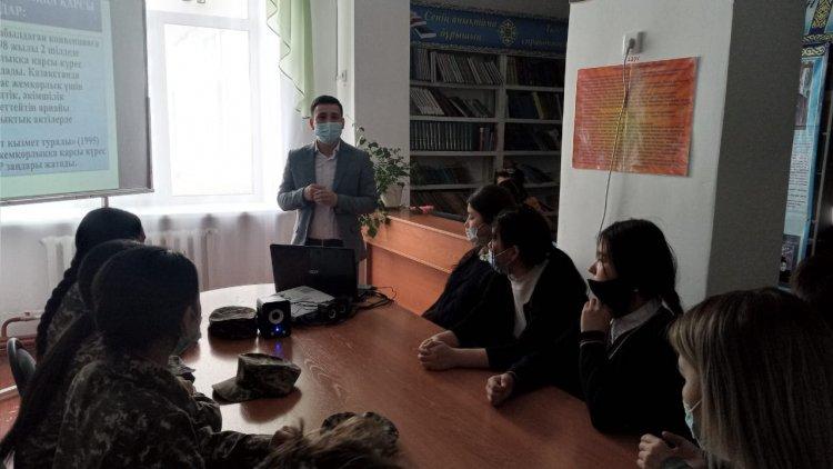 12.03.2021 жыл күні «Маяковский атындағы орта мектебі» КММ-де сыбайлас жемқорлықтың алдын –алу, жол бермеу, адам құқықтары жайлы түсініктерін қалыптастыру, өз ойларын еркін жеткізе білу, дүниетанымдарын кеңейту мен патриоттық тәрбие қалыптастыру мақсатында 9 сынып оқушыларымен пікірталас болып өтті.