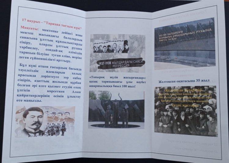 17 наурыз – «Тарихқа тағзым» күніне орай «Маяковский атындағы орта мектебі» КММ-нің тарих пәні бірлестігі ұстаздары мектепке келушілерге «Тарихын білген халықтың болашағы айқын» тақырыбымен жаднамалар таратып, видеороликтер көрсетті. Тәуелсіздіктің 30 жылдығымен байланыстыра жасаған шежірелер тоғысқан суретті тақтайшалар жасалып, мектеп қабырғасынан орын алды. Осы күні 11 сынып оқушыларымен «Алаштың ұлы жаршысы» тақырыбында интеллектуалдық сайыс өткізілді. Топтар өзара «Асық ойнау», «Бәйге», «Сиқырлы ұяшықтар», «Көкпар» кезеңдерінен сүрінбей өтіп, білімдерін ортаға салды. Сайыста озық ойларымен көзге түскен оқушылар марапатталып, зор ықыласқа ие болды.