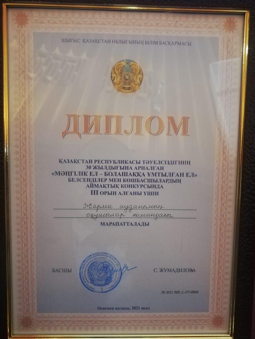 2021 жылғы 29 қарашада ШҚО білім басқармасының «Дарындылық пен қосымша білім беруді дамытудың Шығыс Қазақстан ғылыми-әдістемелік «Дарын» орталығының ұйымдастырумен Қазақстан Республикасы Тәуелсіздігінің 30 жылдығына орай «Мәңгілік ел-болашаққа ұмтылған ел» белсенділер мен көшбасшылардың аймақтық сайысы өткізілді. Сайысқа Маяковский атындағы орта мектебінің командасы қатысып, жүлделі ІІІ орынға ие болды. Команда құрамын және жетекшісі Е.Сапашты, тарих пәні мұғалімі Ү.Омарованы, сахналық әрлеуші Б.Нурлановтарды жеңістерімен құттықтаймыз!