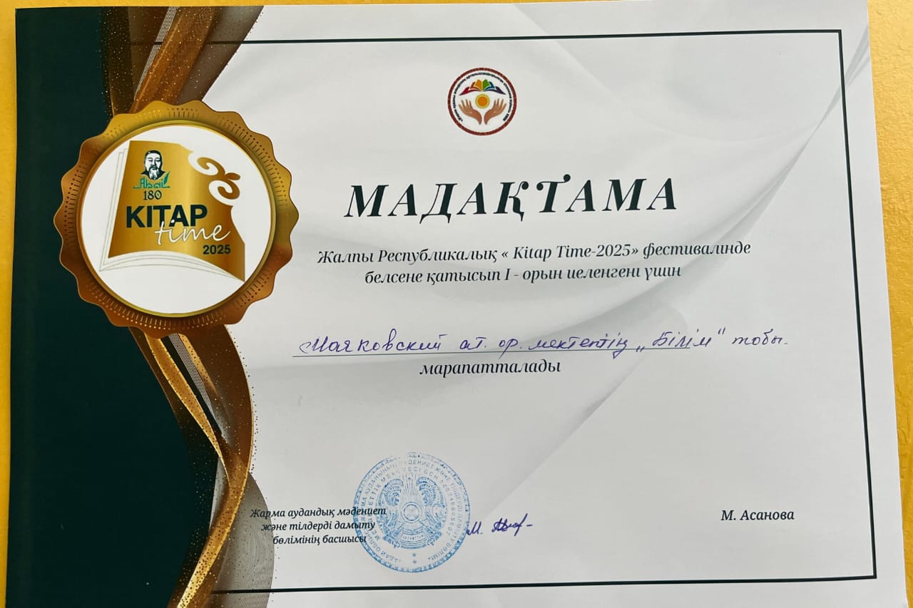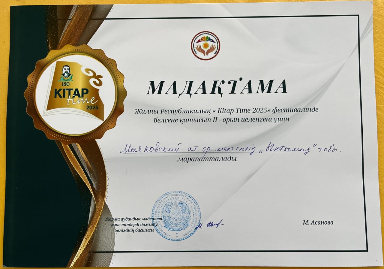 📘Аудандық кітапханада өткен жалпы республикалық “KITAP TІМЕ – 2025” фестиваліне мектебіміздің 9-сынып оқушылары белсене қатысты.