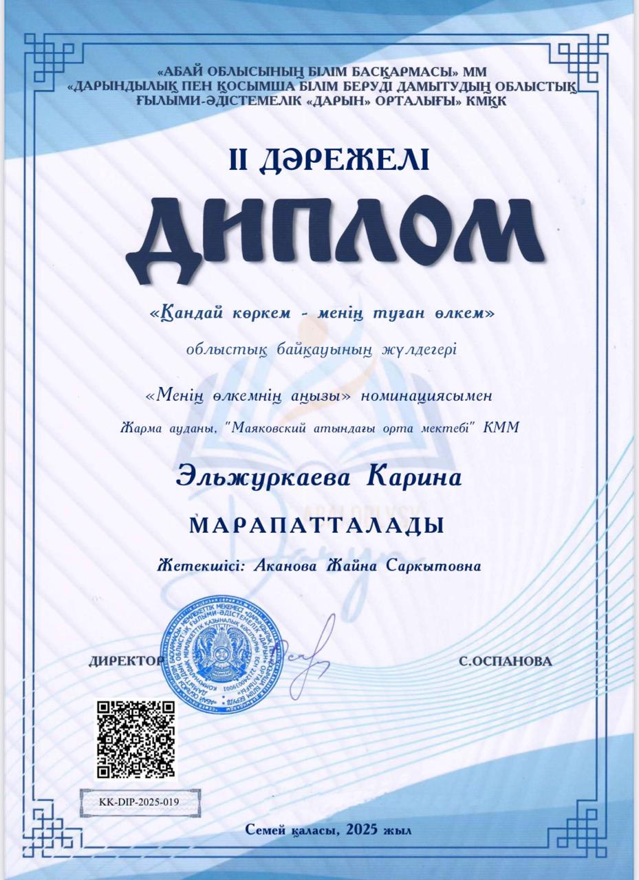 ✅ "Қандай көркем-менің туған өлкем" атты ОБЛЫСТЫҚ байқауында «МЕНІҢ ӨЛКЕМНІҢ АҢЫЗЫ» номинациясы бойынша 7 «Б» сынып оқушысы ЭЛЬЖУКАЕВА КАРИНА қатысып, жүлделі II ОРЫН иеленді.