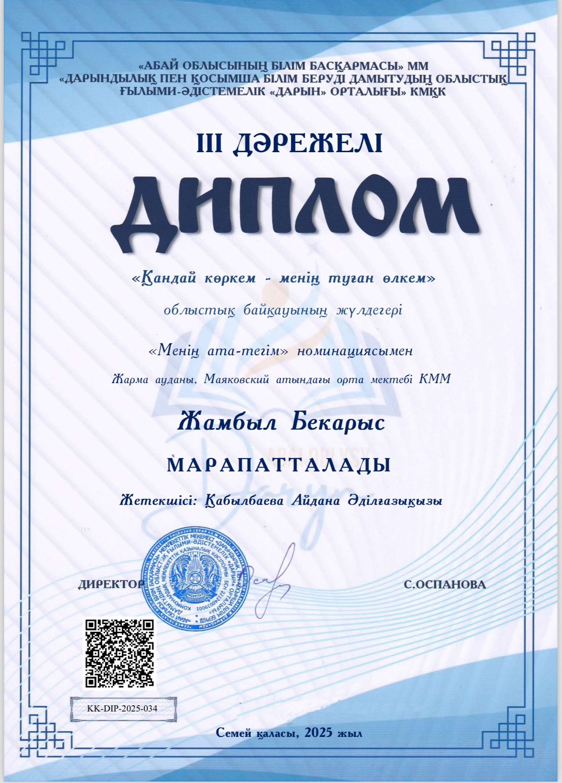 ✅ "Қандай көркем-менің туған өлкем" атты ОБЛЫСТЫҚ байқауында «МЕНІҢ АТА - ТЕГІМ» номинациясы бойынша 10 «А» сынып оқушысы ЖАМБЫЛ БЕКАРЫС қатысып, жүлделі III ОРЫНДЫ иеленді.