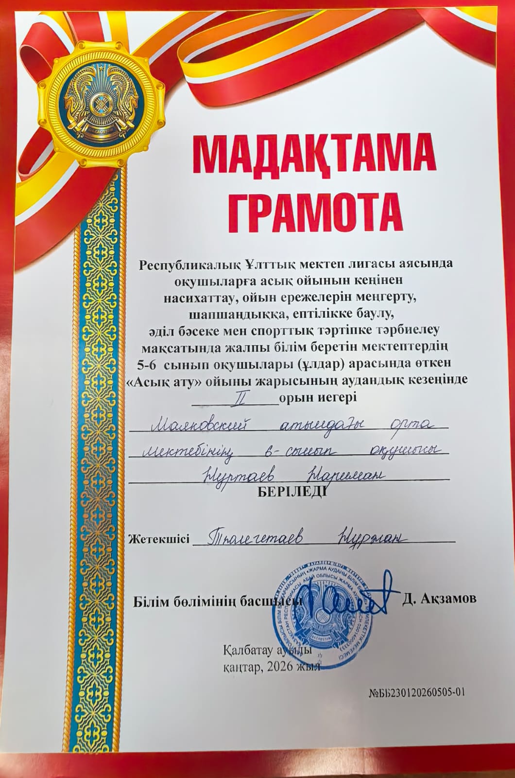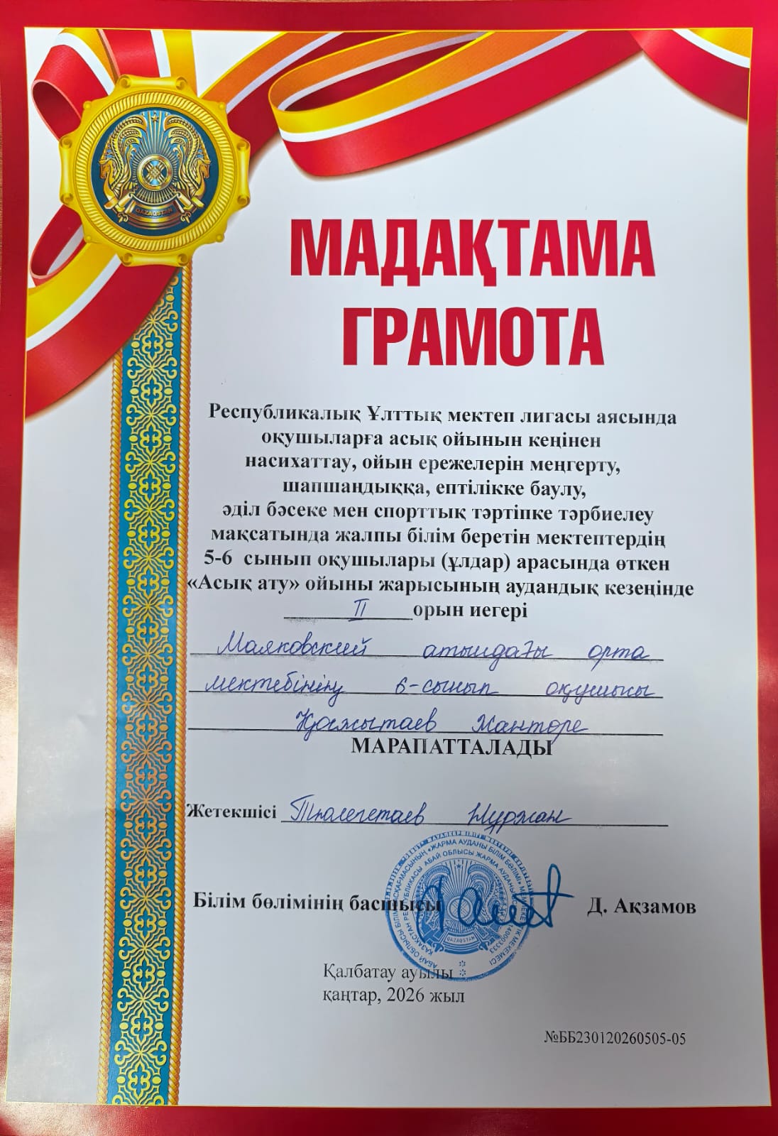 🥈Жалпы білім беретін мектептердің 5-6-сынып оқушылары арасында өткен Республикалық ҰЛТТЫҚ МЕКТЕП ЛИГАСЫНЫҢ АУДАНДЫҚ кезеңінде АСЫҚ АТУ ОЙЫНЫ жарысында мектеп командасы жалпы командалық есепте жүлделі ІІ ОРЫНДЫ иеленді.